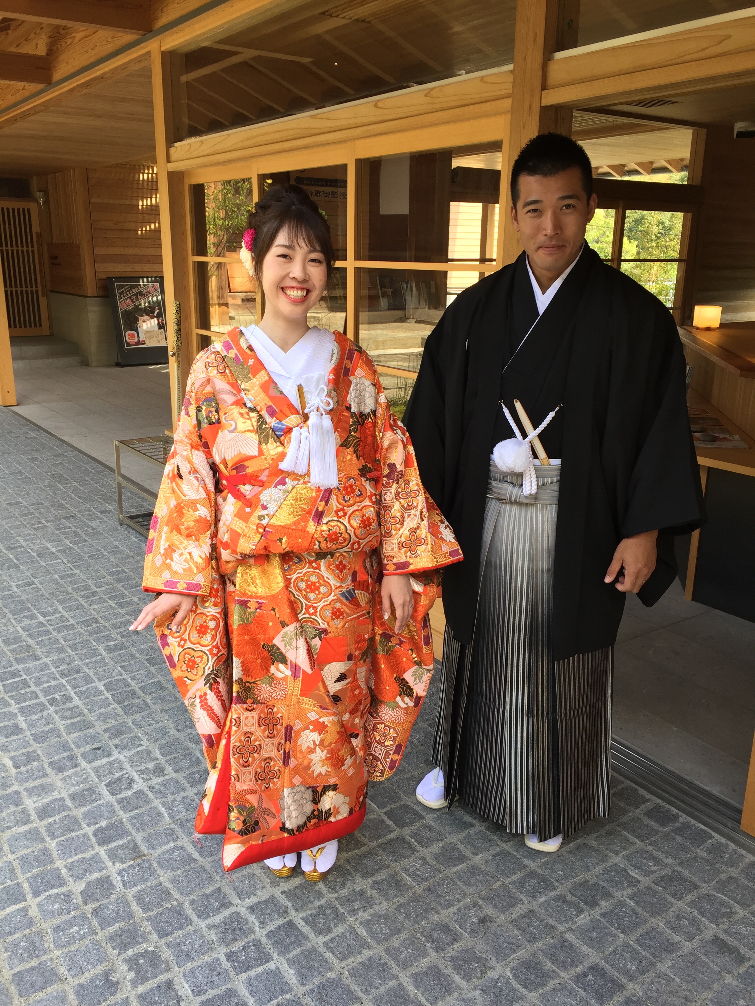 In het stempelbureau van de tempel kwam ons een bruidspaar tegemoet. Ze zouden gaan trouwen volgens (Shinto? Boeddhistische?) rituelen, want ze overhandigden een officieel uitziend papier aan de dame van het stempelbureau en wilden daarna natuurlijk voor ons poseren.