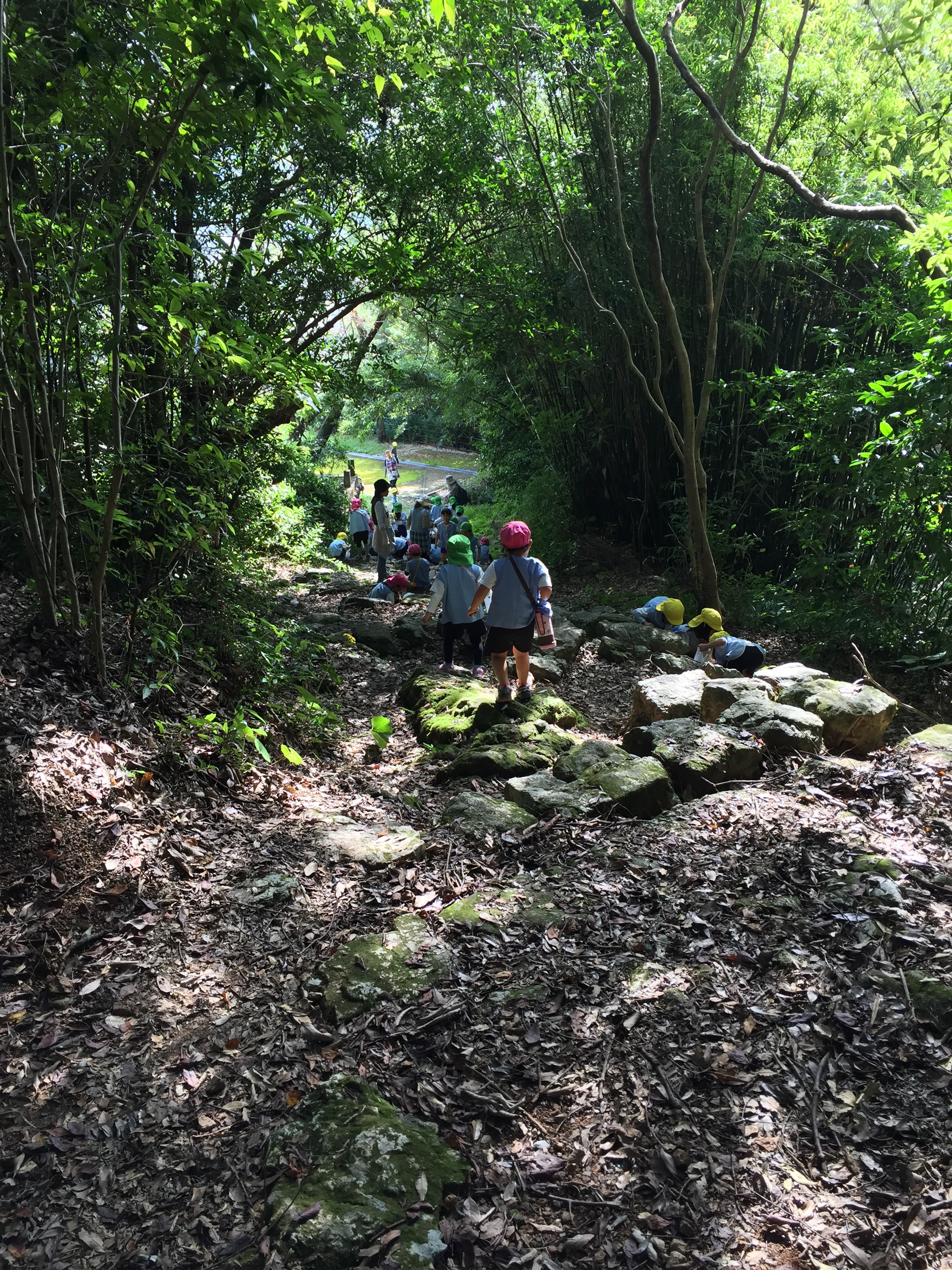 Na tempel 31 moesten we weer naar beneden en daar troffen we een groep kleuters aan die enthousiast allerlei spullen verzamelden. Dit begrepen we natuurlijk direct. Voor de herfsttafel! Het was weer een onmogelijk pad, maar de kleuters klommen over de stenen alsof ze op straat liepen.