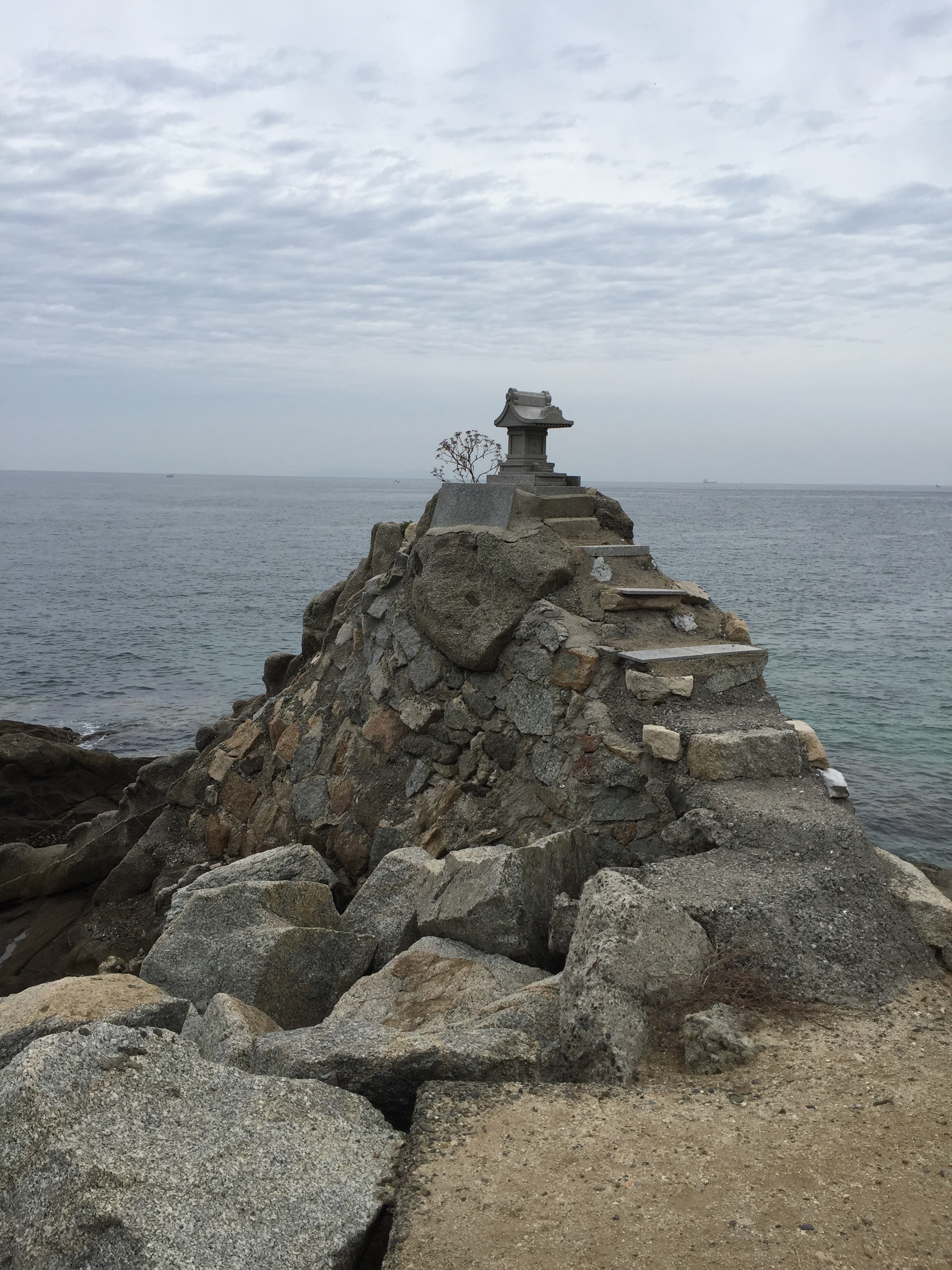 Na enkele uren (en tempel 53) bereikten we weer de (nu) zee, de Seto binnenzee. Er staan nog wel borden waarop staat aangegeven hoeveel meter je boven de zeespiegel bent en er zijn ook nog borden die wijzen naar de ‘rescue places’, maar er zijn geen hoge tsunamitorens meer.