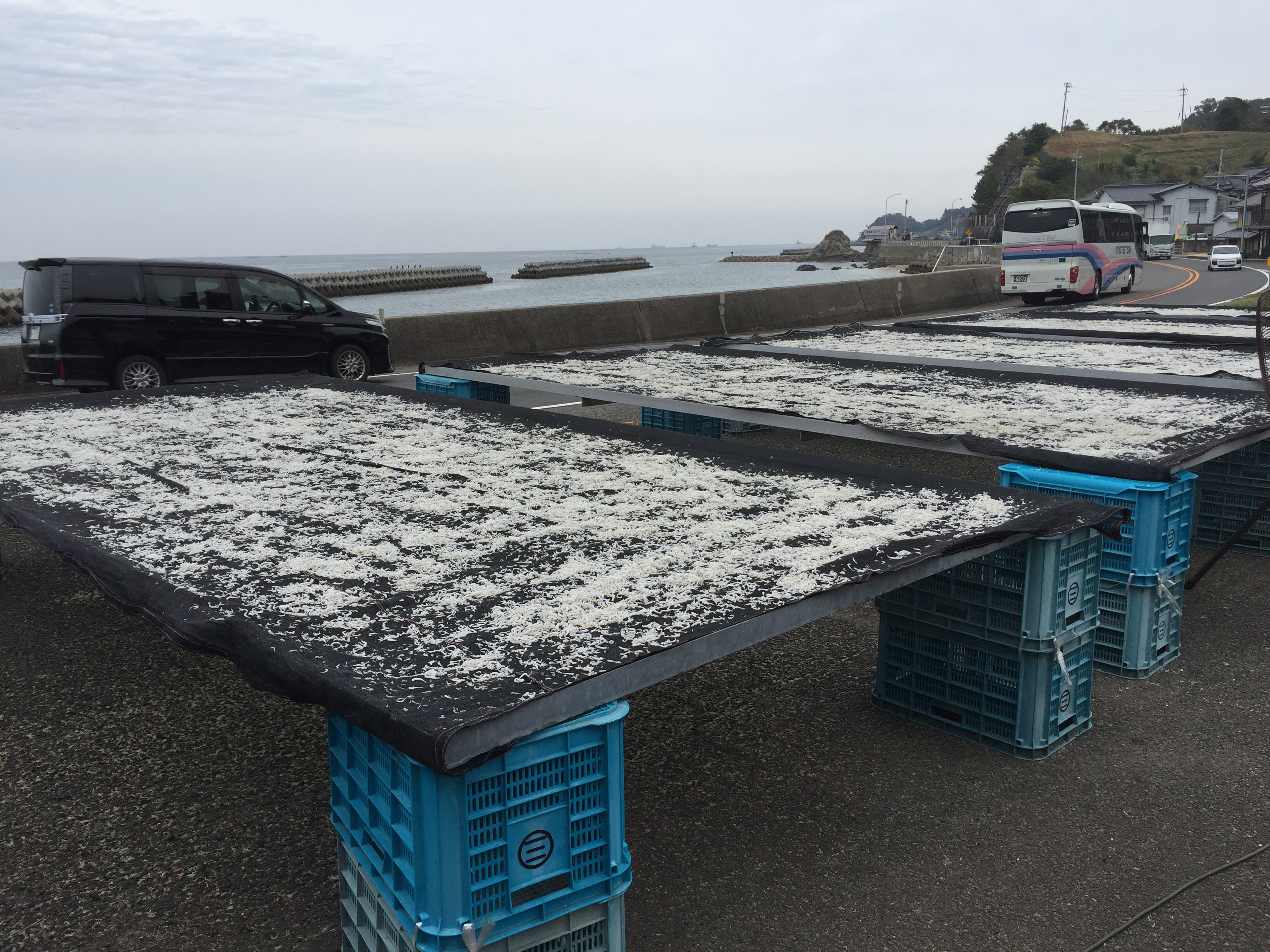 Bij het ontbijt krijg je heel vaak wat gedroogde kleine wormpjes? Visjes? Nou ja, hier liggen ze dus te drogen, het zijn wormpjes.