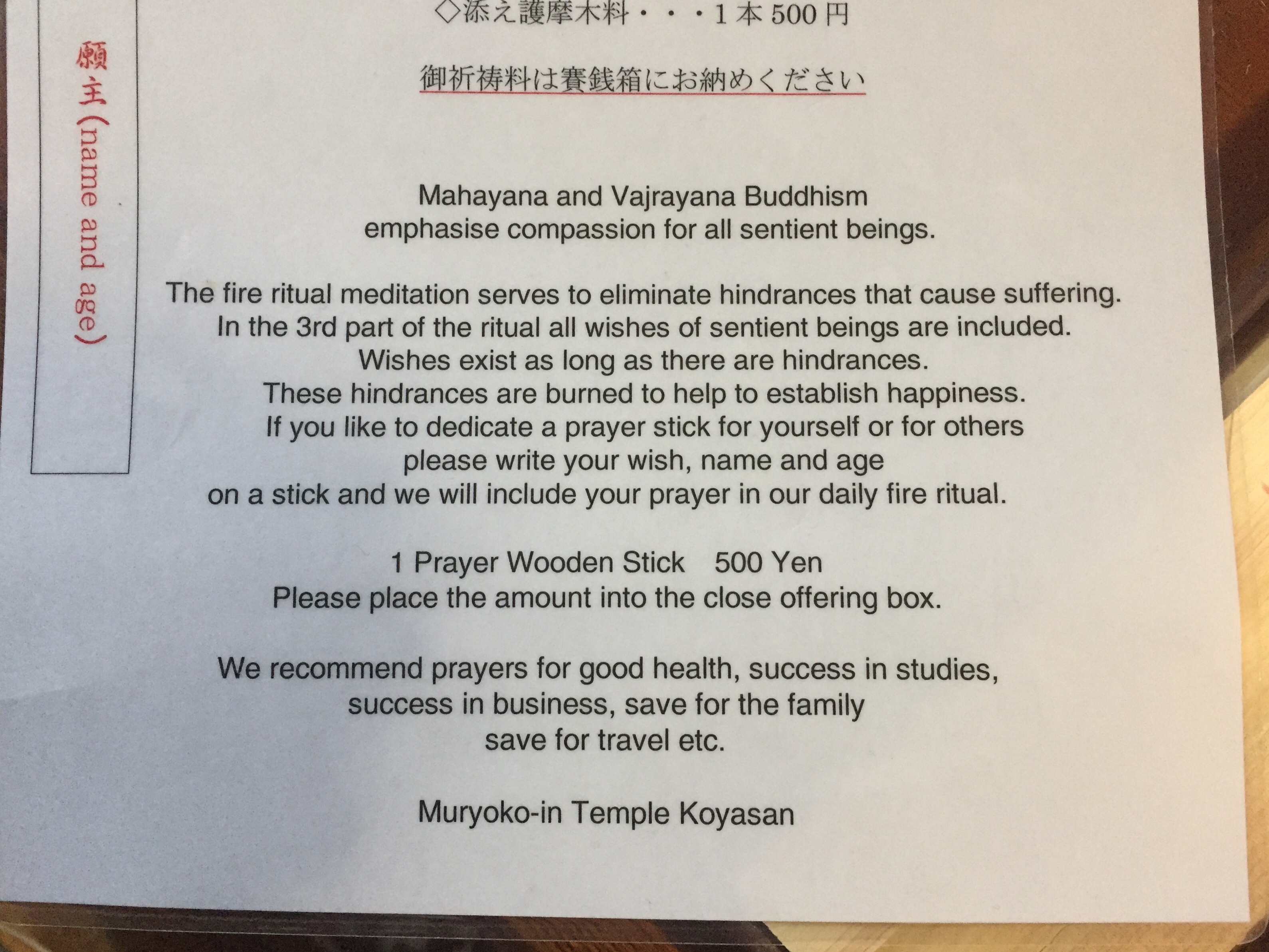 Woensdag 18 december Vanochtend om 5 voor 6 liepen we weer door deze gang op weg naar de ceremonie. Het is een mooie ceremonie met prachtig gezang. Een ander onderdeel is weer het goma-ritueel. Op onze kamer liggen ‘gebedsstokjes’ en een viltstift waarmee we een wens op het gebedsstokje kunnen schrijven.