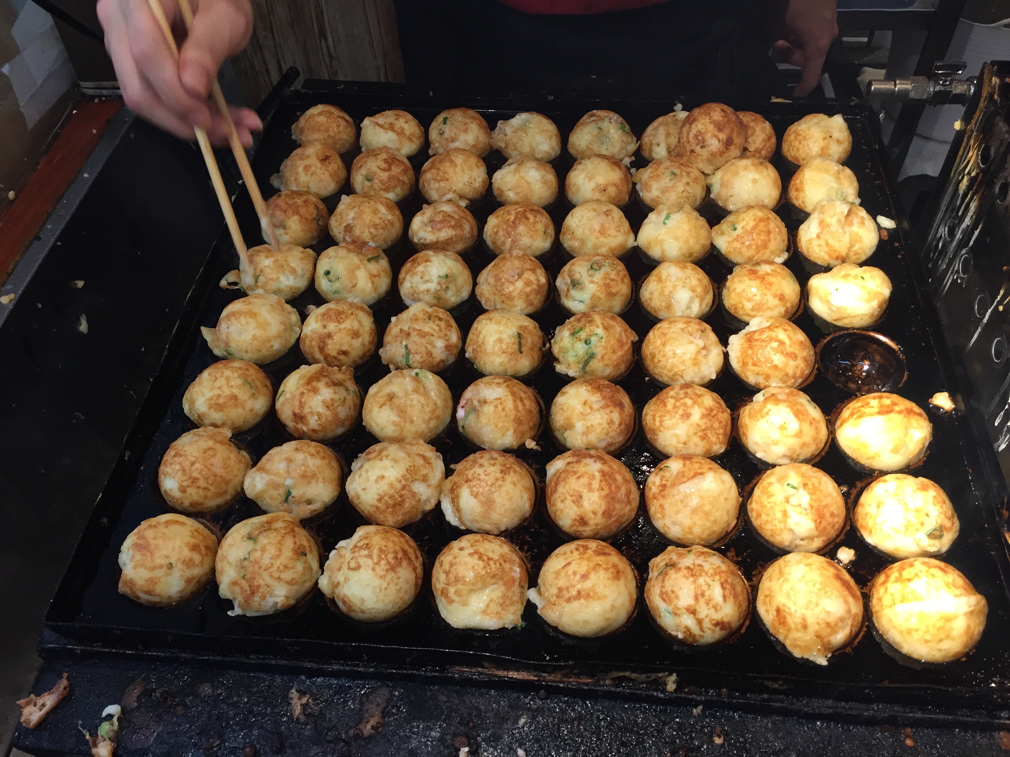 Okonomiyaki is te omschrijven als een hartige pannenkoek. Een pannenkoek waarop een laagje kool wordt gelegd, gevolgd door bv inktvis, een sausje, eventueel nog een groente met als slot weer iets stevigs met bedekt met mayonaise, tomatensaus en wat groen strooisel. (onbekend wat). Het geheel wordt op een hete plaat gebakken en daarna geserveerd en dan snijd je er met een mes stukken af die daarna met de stokjes worden opgegeten……….zonder dat er stukjes vulling tussen uitvallen. Dit lukte ons aardig, na 10 weken o hasji (stokjes) training.