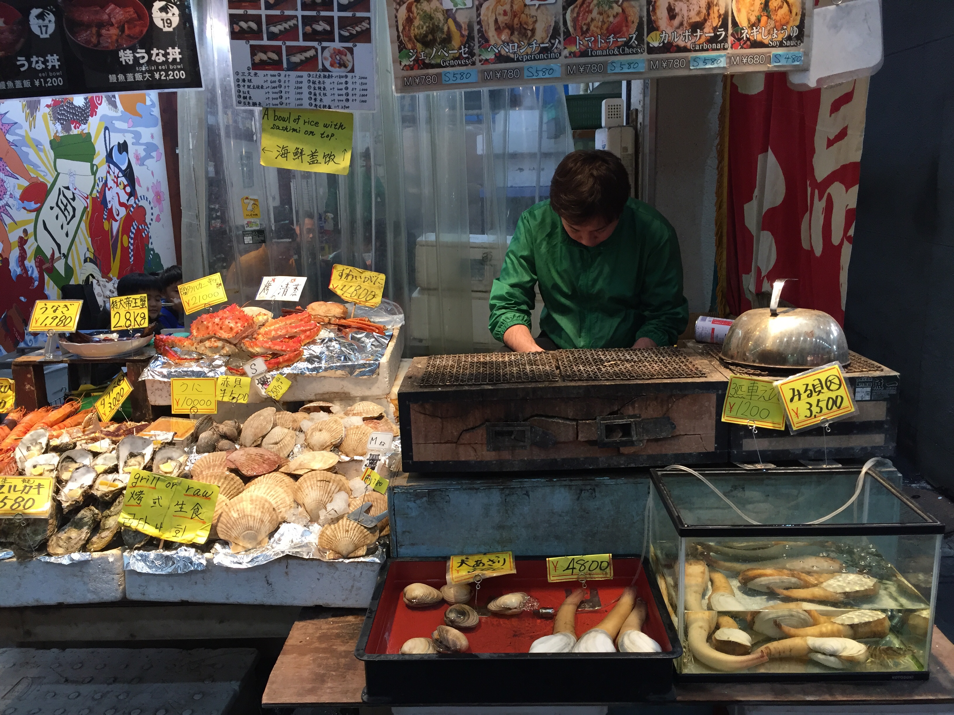 En wat wandelend door het centrum (eindelijk een soort centrum) van Osaka zagen we veel gokhallen met daarin veel mensen, veel winkels en mensen met tassen vol, want ze houden hier erg van kopen, kopen en kopen. Er zijn hier veel restaurantjes en kleine eettentjes. Die zijn we vandaag (donderdag) maar eens gaan uit proberen.