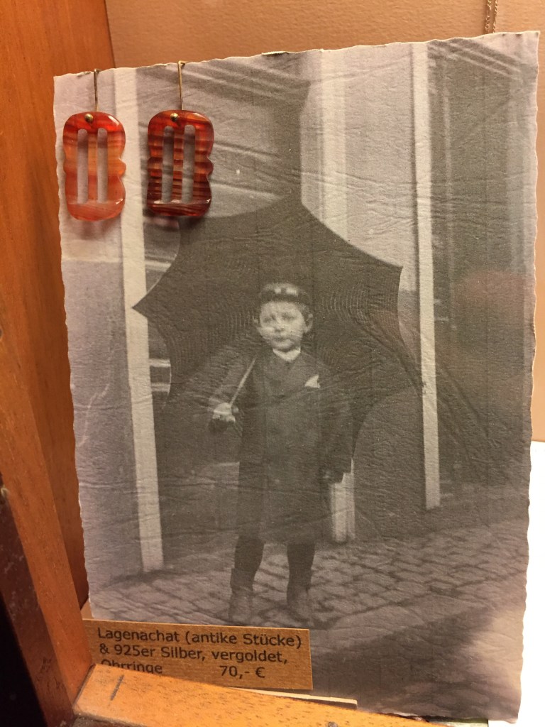 Idar Oberstein is dus edelstenen, overal zijn edelstenen, ik blijk zelfs een stuk van de ‘Steinenwege’ te lopen. Ook het hotel doet hier aan mee, dit op haar eigen wijze. De sieraden zijn over mooie oude ansichtkaarten gehangen.