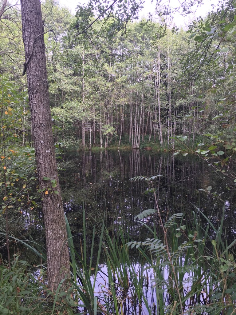 Het pad liep nu door en over (via een hele lange planken-brug) een moeras. Langs dit beeldige meertje genaamd het Tranendal.