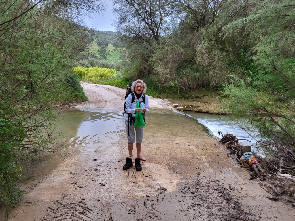 En we moesten weer een ‘rivier’ over. Hier zijn we door de boekjes en blogs die we lezen erg voor gewaarschuwd: scherpe steentjes op de bodem (ik sleep hiervoor al de hele tijd sandalen mee) en een stevige stroming (hiervoor heb ik stokken mee bij me).