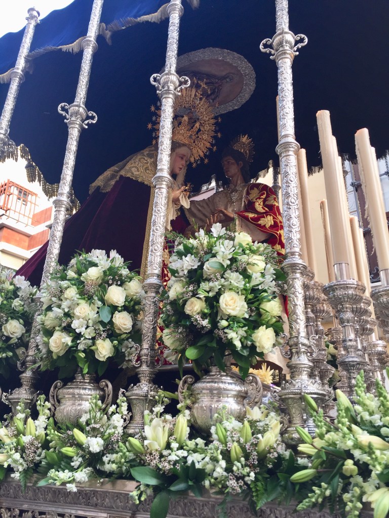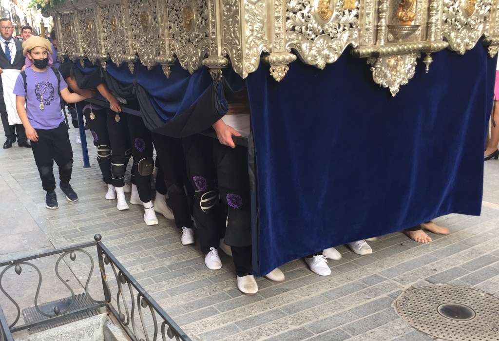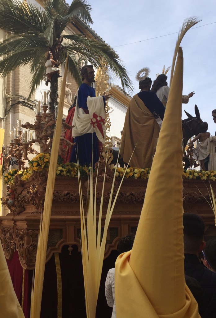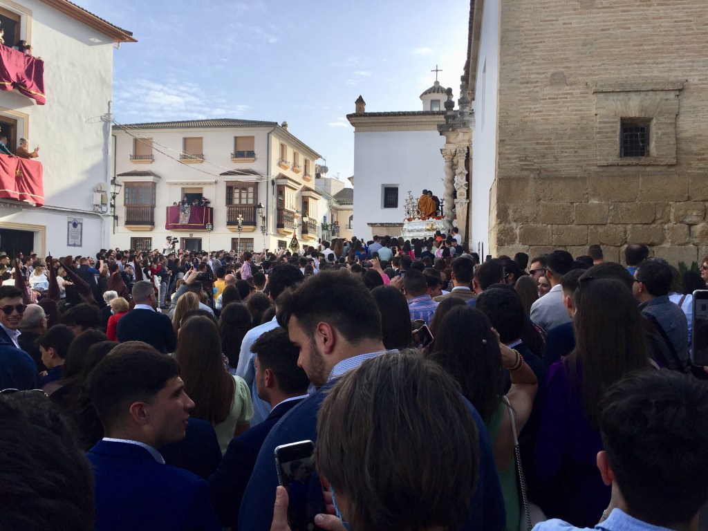 Elke parochie/kerk heeft zijn eigen attributen voor een processie en aan de muur bij de ingang van een kerk hangt het schema van die kerk voor de komende week. Ook zijn bij de plaatselijke vvv komplete overzichten te krijgen. In Antequera zelfs in de vorm van een in kleuren gedrukt boekje. En hier in Cabra kan het je dus gebeuren dat je door een doodstille straat loopt, muziek hoort en 2 tellen later als je een hoek bent om gegaan in het publiek verstrikt ben geraakt.