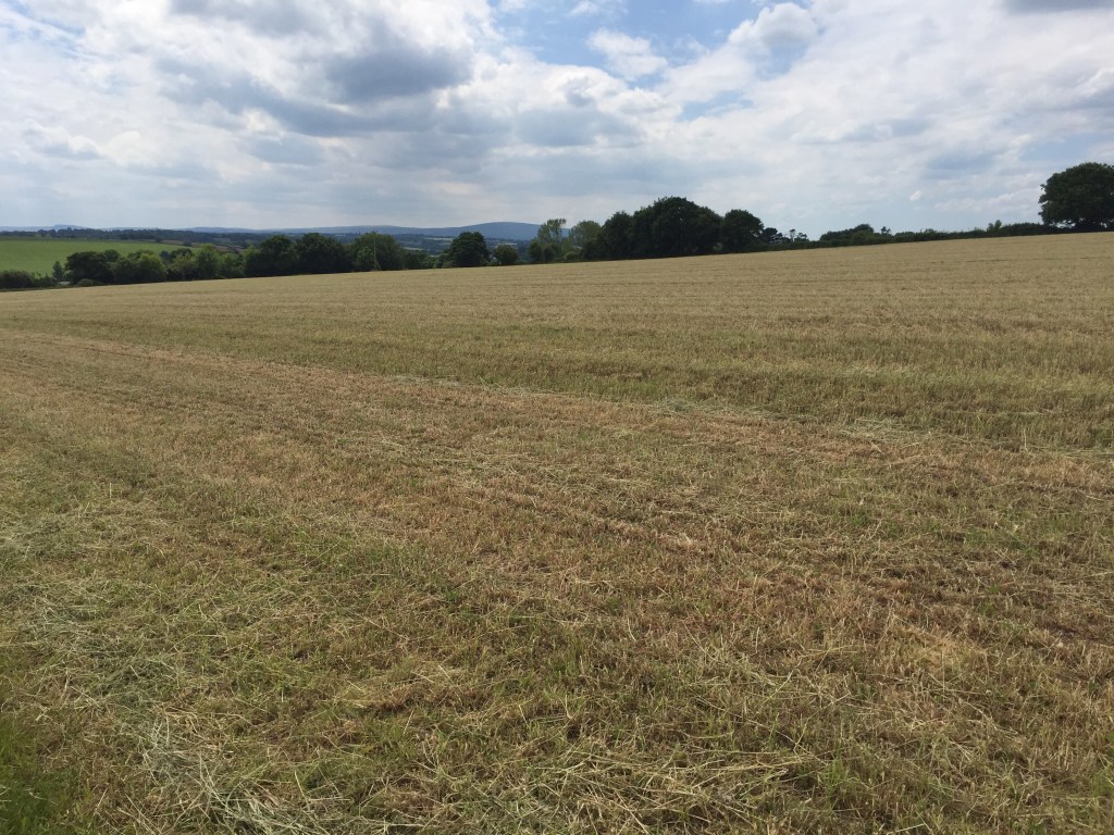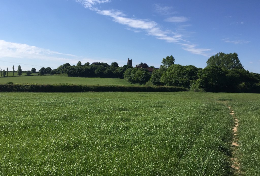 Het is vandaag ‘lopen over velden’, veel velden, allen maar velden. Soms zijn ze wel een kilometer lang. De velden zijn van elkaar gescheiden door hekken, beekjes of muurtjes, dus moet je via overstapjes, hekken, planken en zelfs via trappen van het ene naar het andere veld. Bij elkaar opgeteld liep ik zo 3 uur aaneengesloten over de velden. Heerlijk!