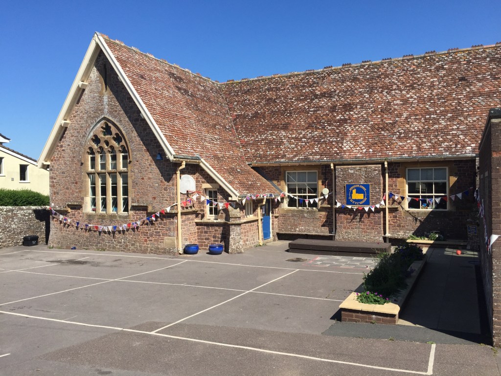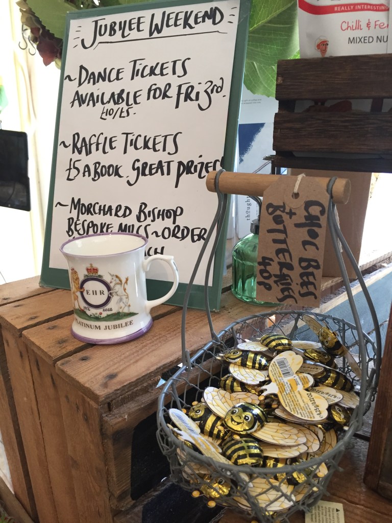 Er staan geen kastanjebomen op het plein, maar verder…. Het hele dorp was versierd met tekeningen over het jubilee, gemaakt door de leerlingen. Bij de plaatselijke winkel (deze verkocht werkelijk alles) kocht ik een cappuccino (er was een dito apparaat) en deze heb ik heerlijk op een bankje voor de shop opgedronken.