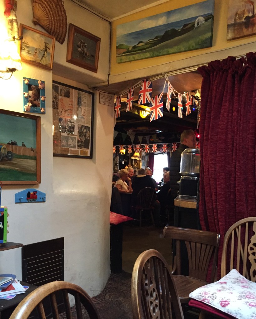 Ik had graag van bijna iedereen in deze pub een foto gemaakt. De vrouw die me verzocht achterin de bak te springen was hier zeker niet de enige in haar soort. Ik durfde niet, helaas. Maar ter illustratie: er zat ook een vrouw in haar b.h. (En toch, zo warm was het niet) en er liepen 6 honden rond. Ik at hier natuurlijk fish and chips. (De azijn, die over de patatten moet heb ik laten staan). Het was heerlijk en heel gezellig.