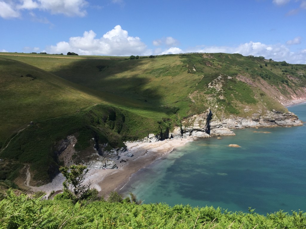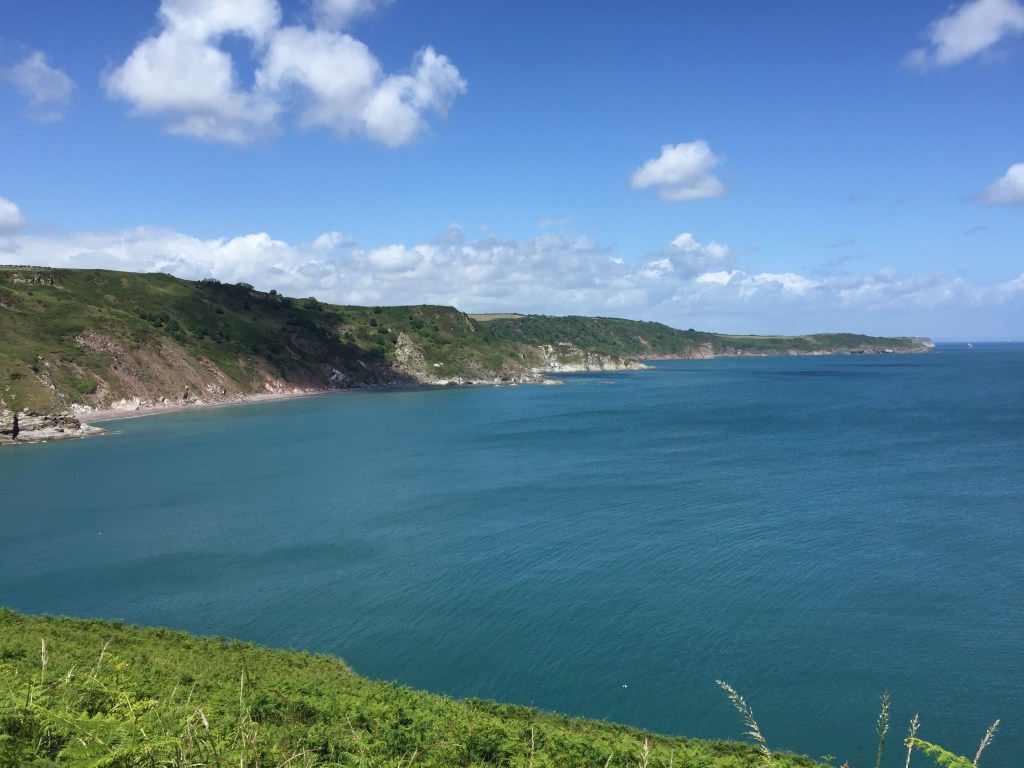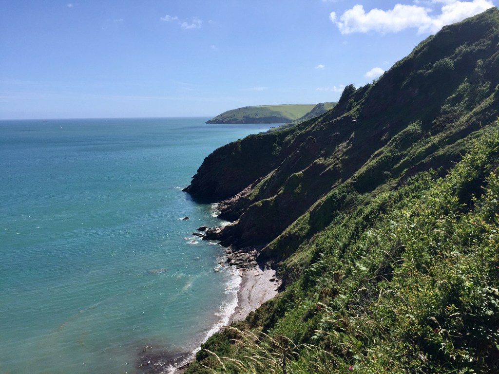 Na Dartmouth worden de kliffen weer hoog. De site spreekt van challenging to strenuous. (Maar dat las ik zojuist, uitgeteld op bed). En ik maar denken wat doe ik er lang over, het schiet maar niet op. Onderweg hoor ik het geluid van zeeleeuwen, ze zijn echter nauwelijks te zien.
