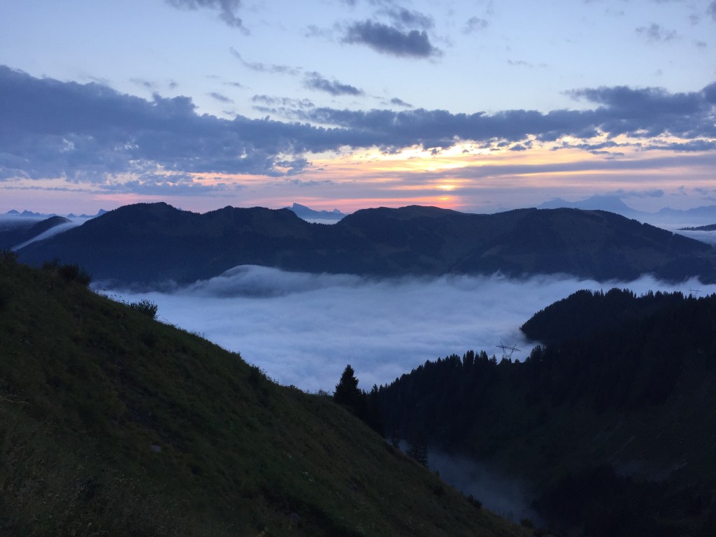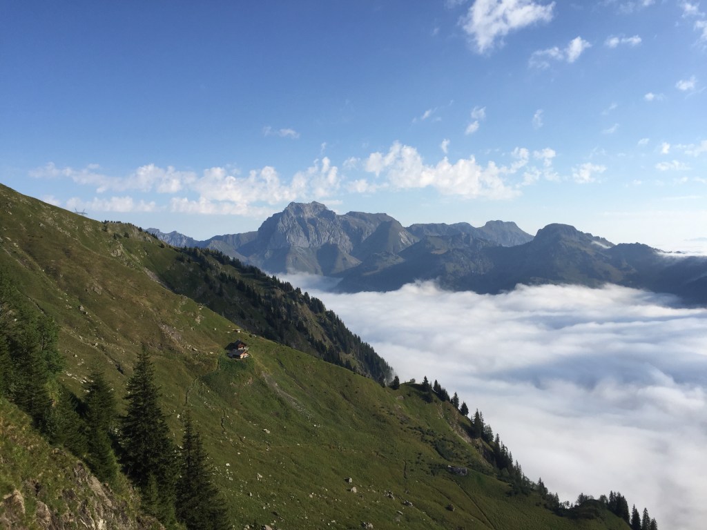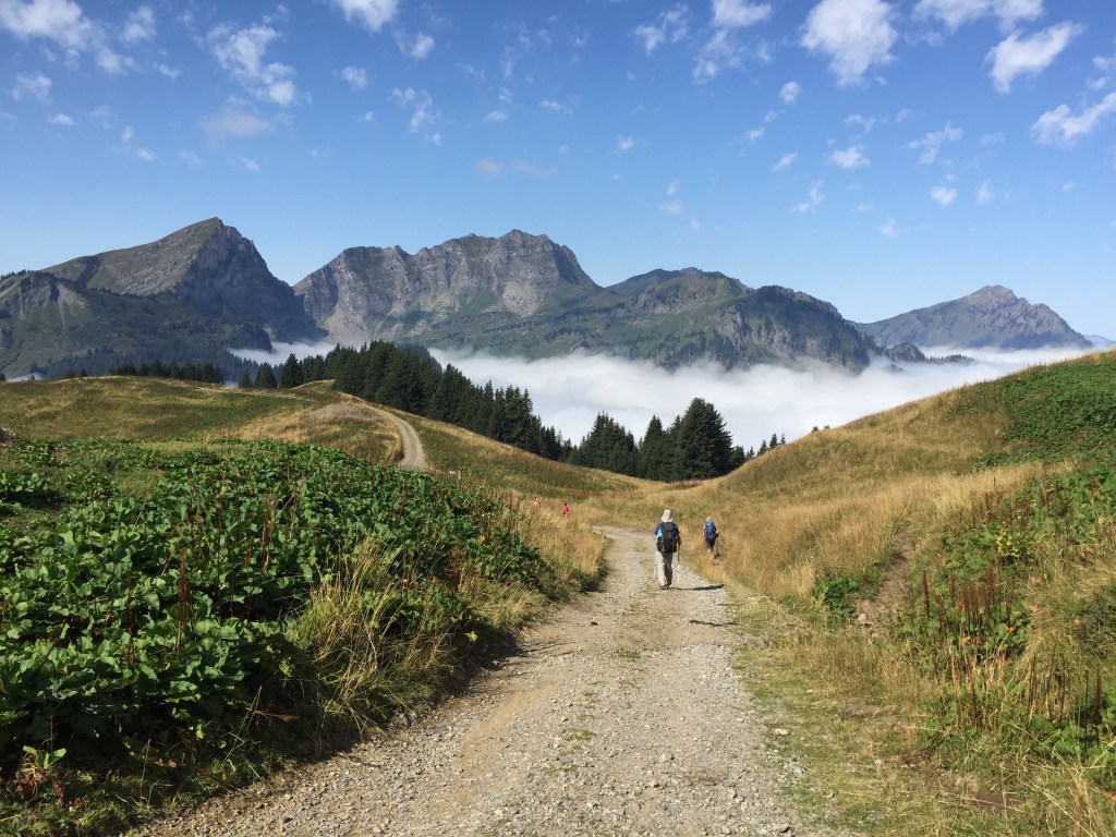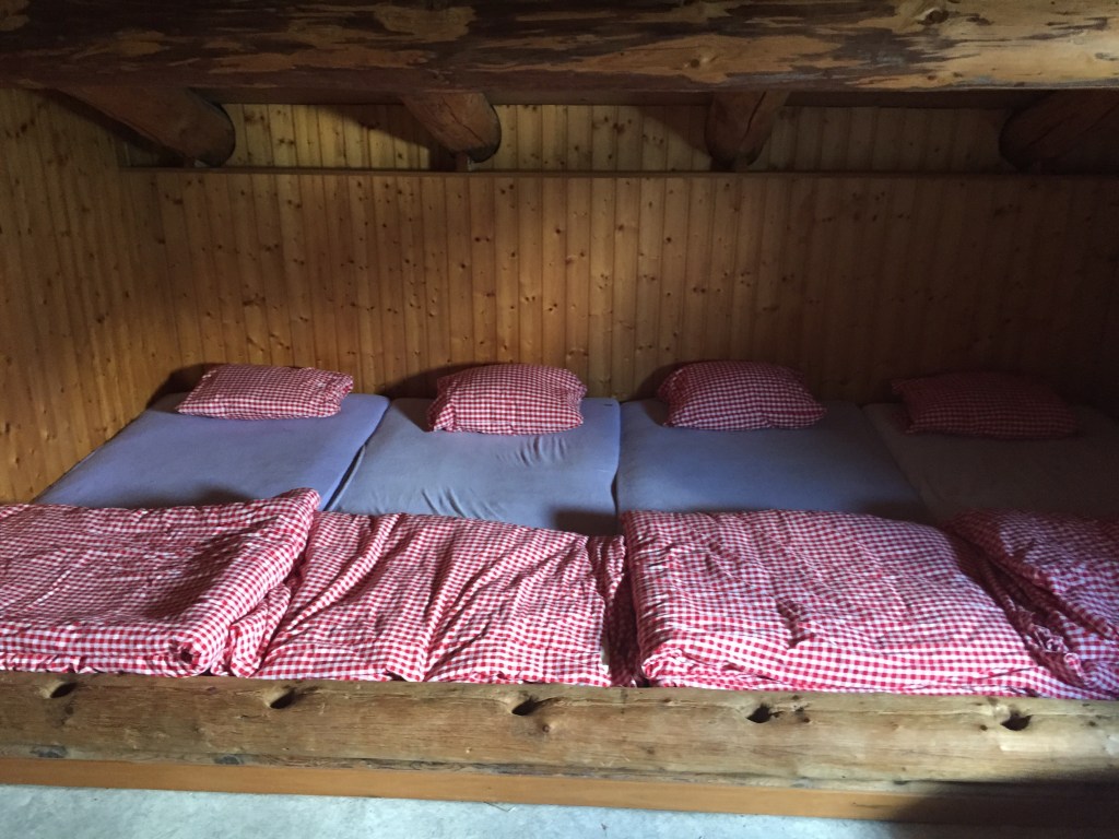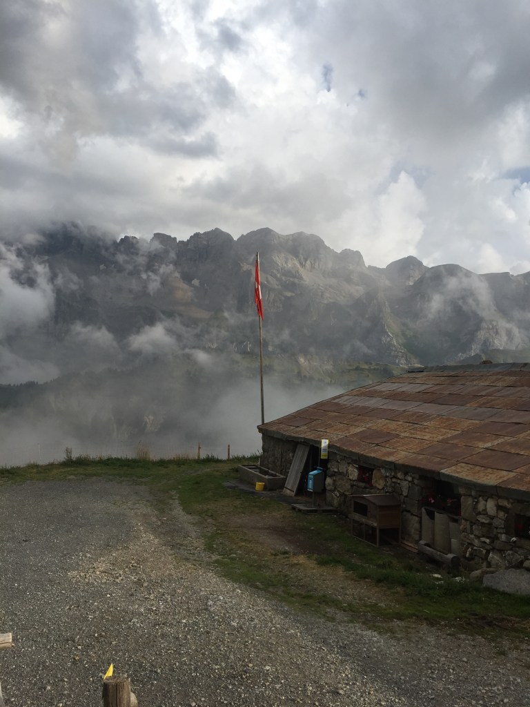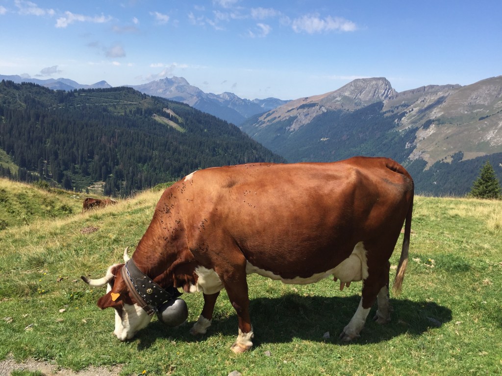 Het is hier de hele dag ‘koeien’, je hoort voortdurend het geklingel van de bellen (ook ‘s nachts, slapen ze niet? Eten ze dan door?) en soms staan ze op het pad en passeren we ze voorzichtig. Gelukkig niets van het achtervolgen zoals de koeien in Engeland nog wel eens deden. Aan het eind van de dag passeerden we de Zwitserse grens, hiervan was niets te merken. We slapen in een Zwitserse Refuge, met wifi! Ik zit schoongewassen, met een warme (!) douche bij het stopcontact in het restaurant dit blog bij te werken met jodelmuziek in mijn oren en mannen met hoedjes met een edelweisje aan de bar. En vanavond wordt het kaasfondue, dus ook deze dag kan niet meer stuk.
