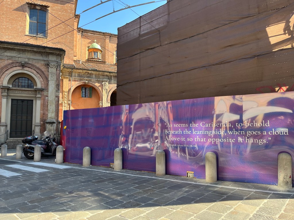 Niemand weet wie de Antaeus is, die Dante hier noemt, maar de dichtregels hangen aan de Garisenda toren. Omdat deze gerestaureerd wordt hebben ze er maar een doek met de -hier- Engelse tekst voor gehangen.