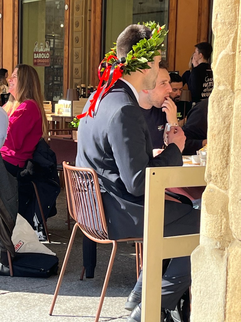 Bologna is een universiteitsstad en het lijkt wel of vandaag iedereen aan het afstuderen is. Telkens zie ik groepjes mensen: het stralend middelpunt met in 9 van de 10 gevallen met een Dante-achtige lauwerkrans om het hoofd, vergezeld door trotse ouders en vrienden. En daar hoort natuurlijk een uitgebreide maaltijd bij.