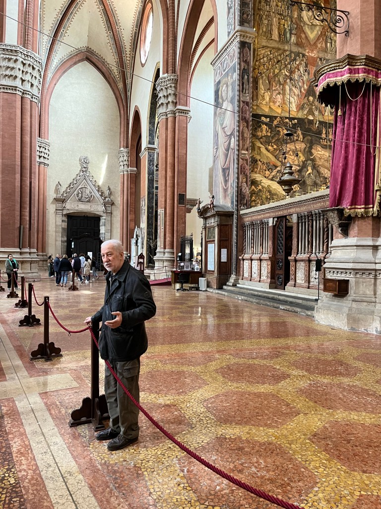 En over wolken gesproken…. Deze man staat elke dag bij de plaats waar de lichtbundel over de meridiaan gaat. Hij heeft zelfs 2 plakbandjes op de grond geplakt, mocht de lichtbundel de weg kwijt zijn…. Al wachtende heeft hij alles uitgelegd over deze zonne-tijds-meter. Hij sprak alleen Italiaans, dat was jammer. We zagen het licht langzaam over de grond ‘kruipen’. En net, precies op het moment dat het de meridiaan zou bereiken kwam er een wolk voor de zon, en weg was het effect.