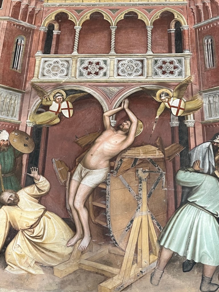 San George, die wordt door 2 engelen van de marteling met het wiel wordt gered