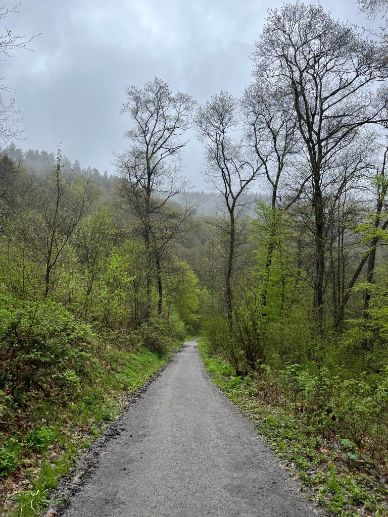 Dat was gisteren, vanochtend was het veel erger. Het ‘Wasser’ viel met ‘bakken uit de hemel’ en het ging maar door. Gehuld in plastic ben ik toch maar op pad gegaan. Er stond een zware tocht met veel stijgen en dalen op het programma. Gezien het weer liet ik die ‘Fels’ maar even zitten en volgde de route ‘op de grond’, op het fietspad langs de rivier de Rur.