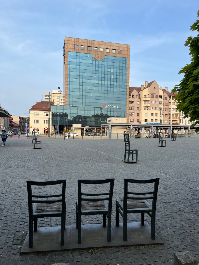 Er zijn uiteindelijk 68.000 Joden uit het ghetto van Krakau weggevoerd. Op de plek van het oude ghetto staan 68 stoelen, 1 lege stoel voor 1000 doden om sjive te zitten. Leeg, want er is niemand meer die sjive kan zitten.