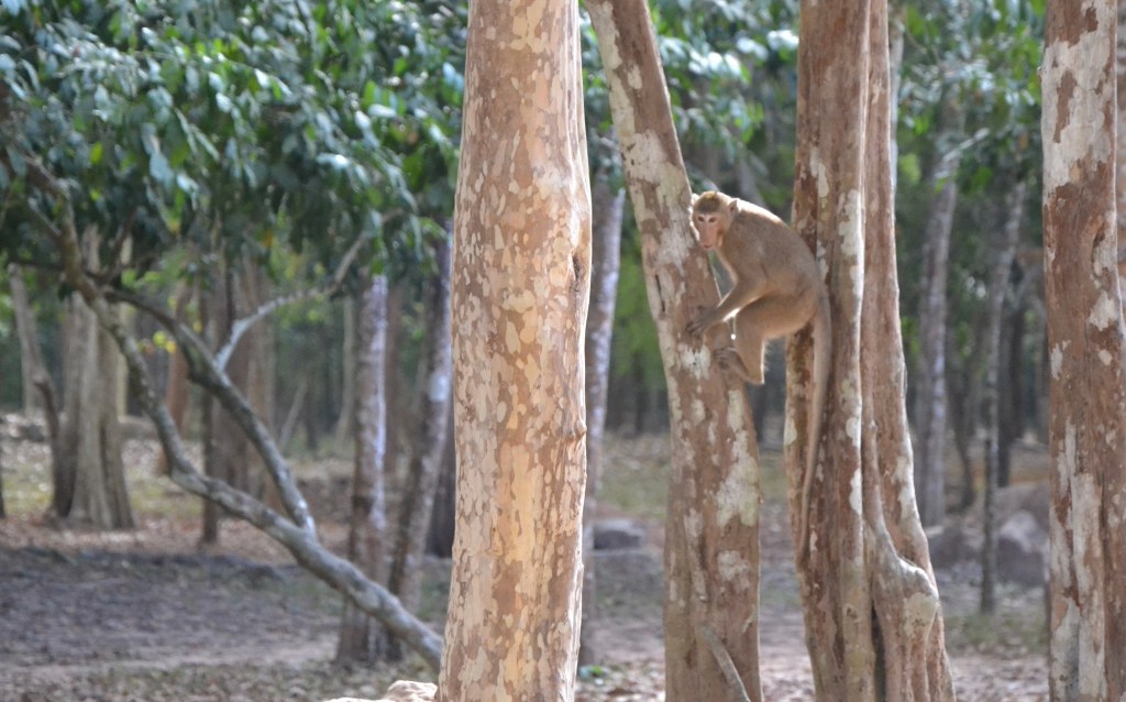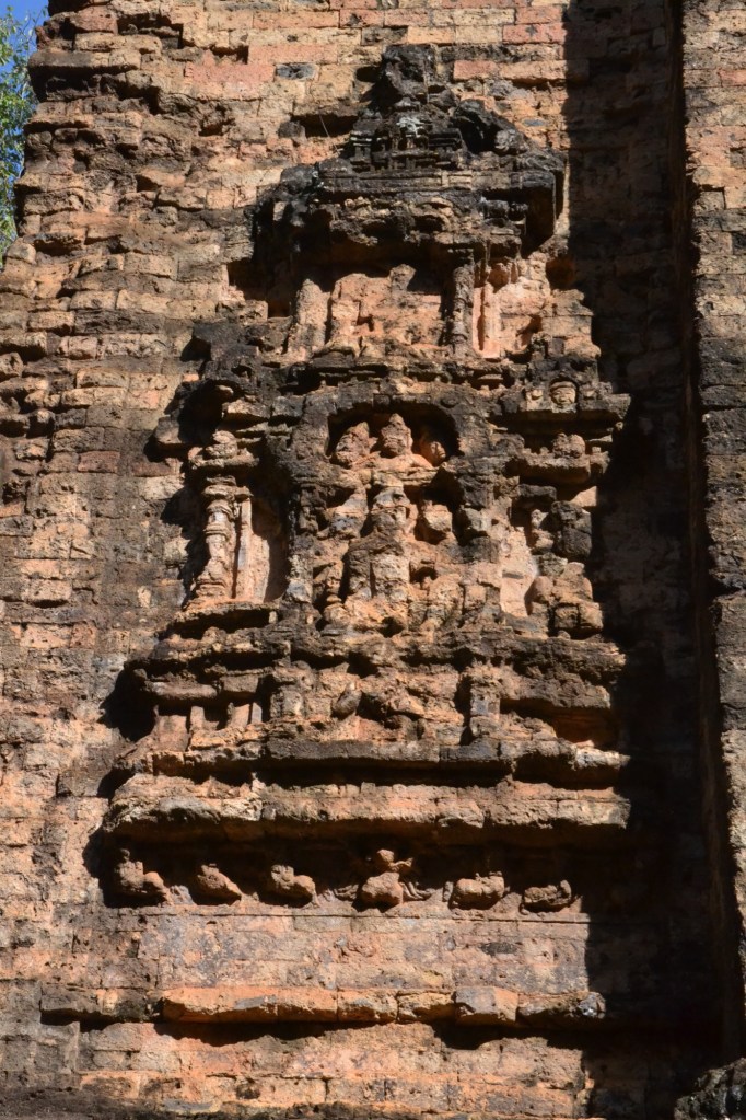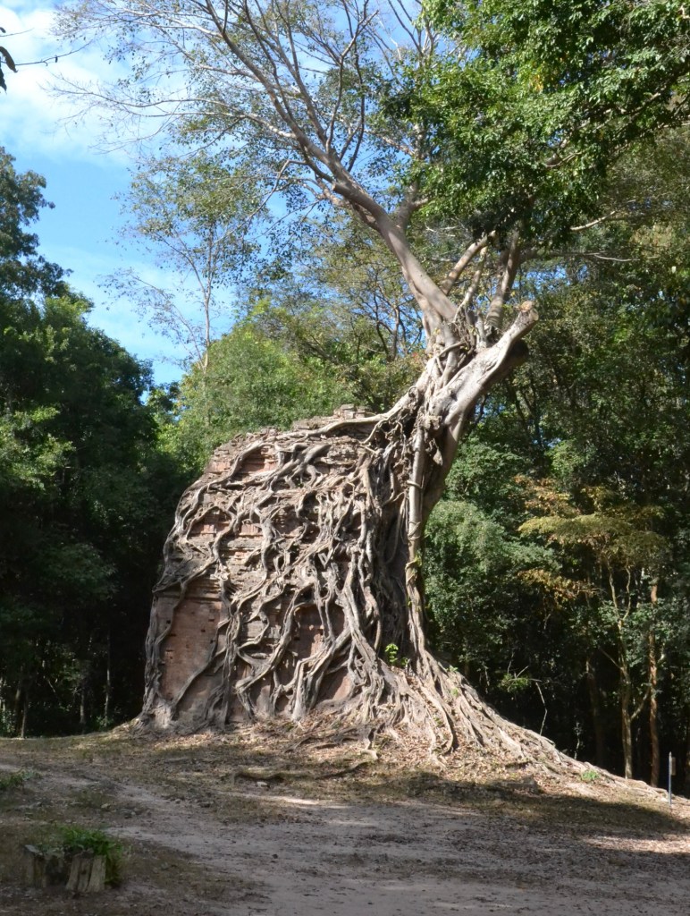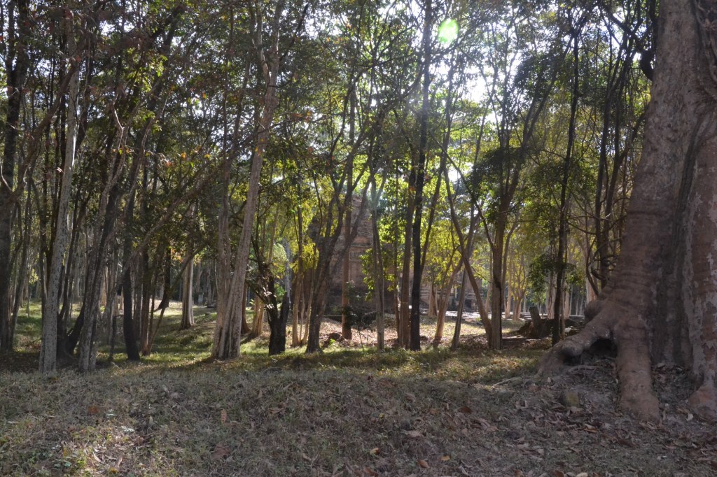 Het tempelcomplex is pre-Angkor en is in de 7e eeuw gebouwd. Er is niet veel van over omdat het in de jaren 70 zwaar door de Amerikanen werd gebombardeerd, en het gebied daarna strijdtoneel in de burgeroorlog werd. Rond de ruïnes liggen nog bomkraters en het is sinds 10 jaar ‘landmijnvrij’. En nu maar hopen dat ze er niet eentje over het hoofd hebben gezien.