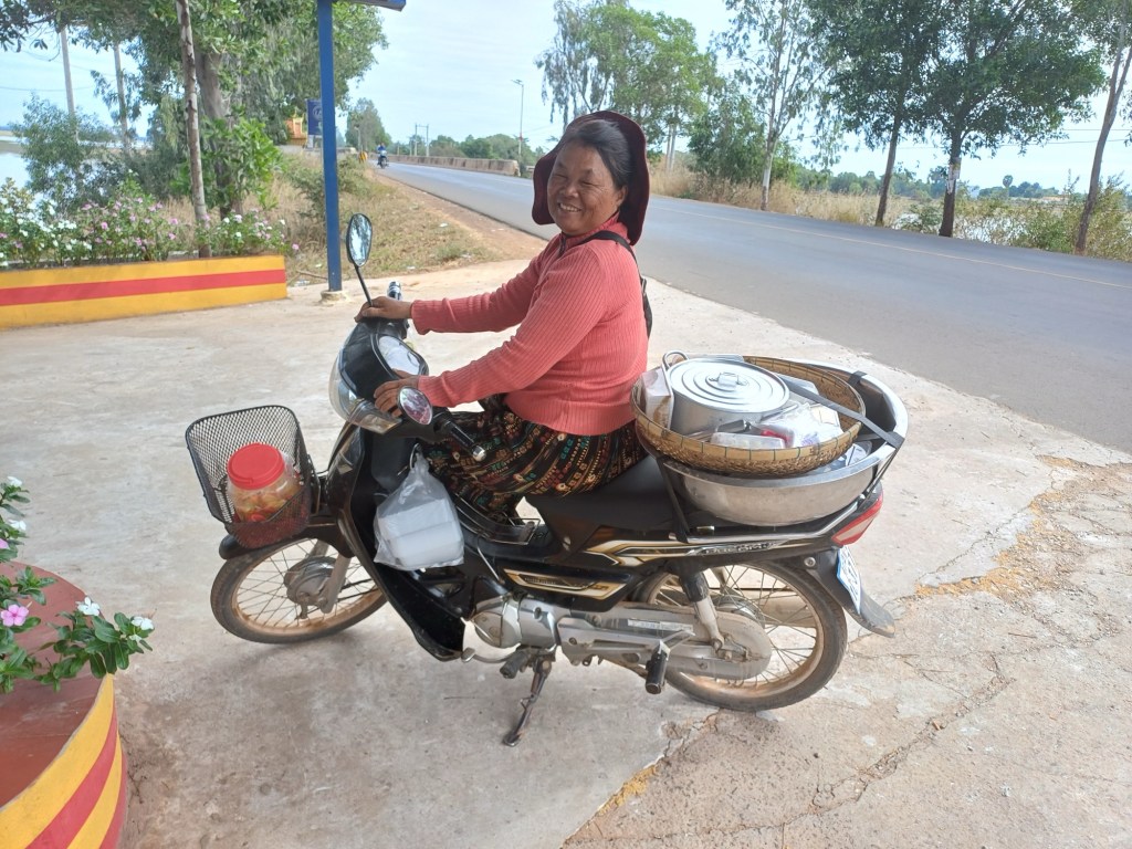 Ik heb eergisteren dan eindelijk het busticket kunnen kopen (ben voor de zekerheid – langs de plek des onheils…- er met een tuktuk naar toe gegaan) en vanochtend vertrokken we met een klein busje keurig op tijd. Zodra je buiten Phnom Penh bent merk je de enorme invloed van China. De bus stopte onderweg in een wegrestaurant, dit was geheel Chinees, t/m de zo typische Chinese geur. Maar ze hadden koffie!