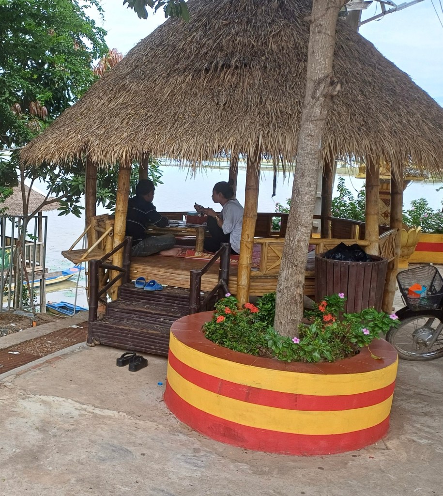 Dit bestaat uit een groot restaurant met aan het meer allemaal hutjes met zitjes. Om 10 uur zitten er al veel mensen te eten. (Dat doen ze overigens de hele dag).