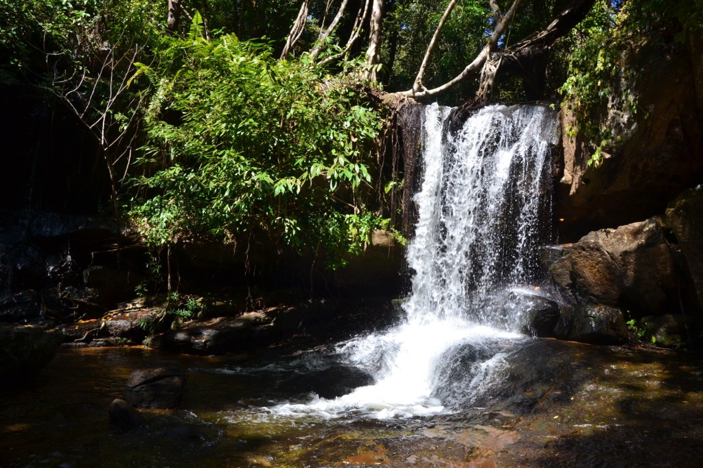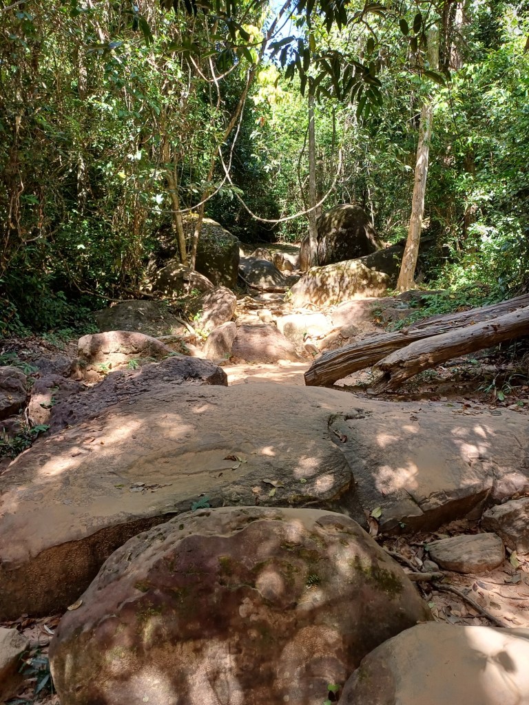 Rond en in een zgn yoni (symbolische weergave van het vrouwelijke element Vishnu) liggen er duizenden bijna ronde vormpjes van linga’s (het mannelijke element Shiva). Weer een stuk verder lopen was daar de waterval. Ik had erg veel geluk hier in het droge seizoen te lopen, je moet er niet aan denken als alles nat is en je je een weg naar boven en naar beneden moet glibberen.