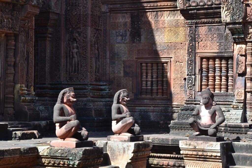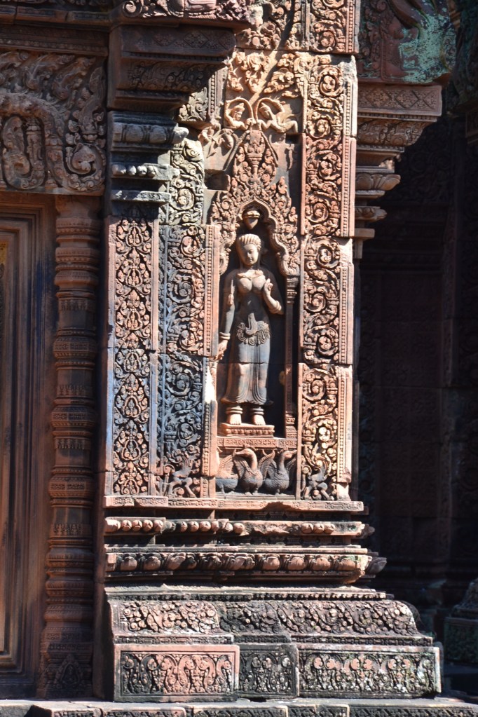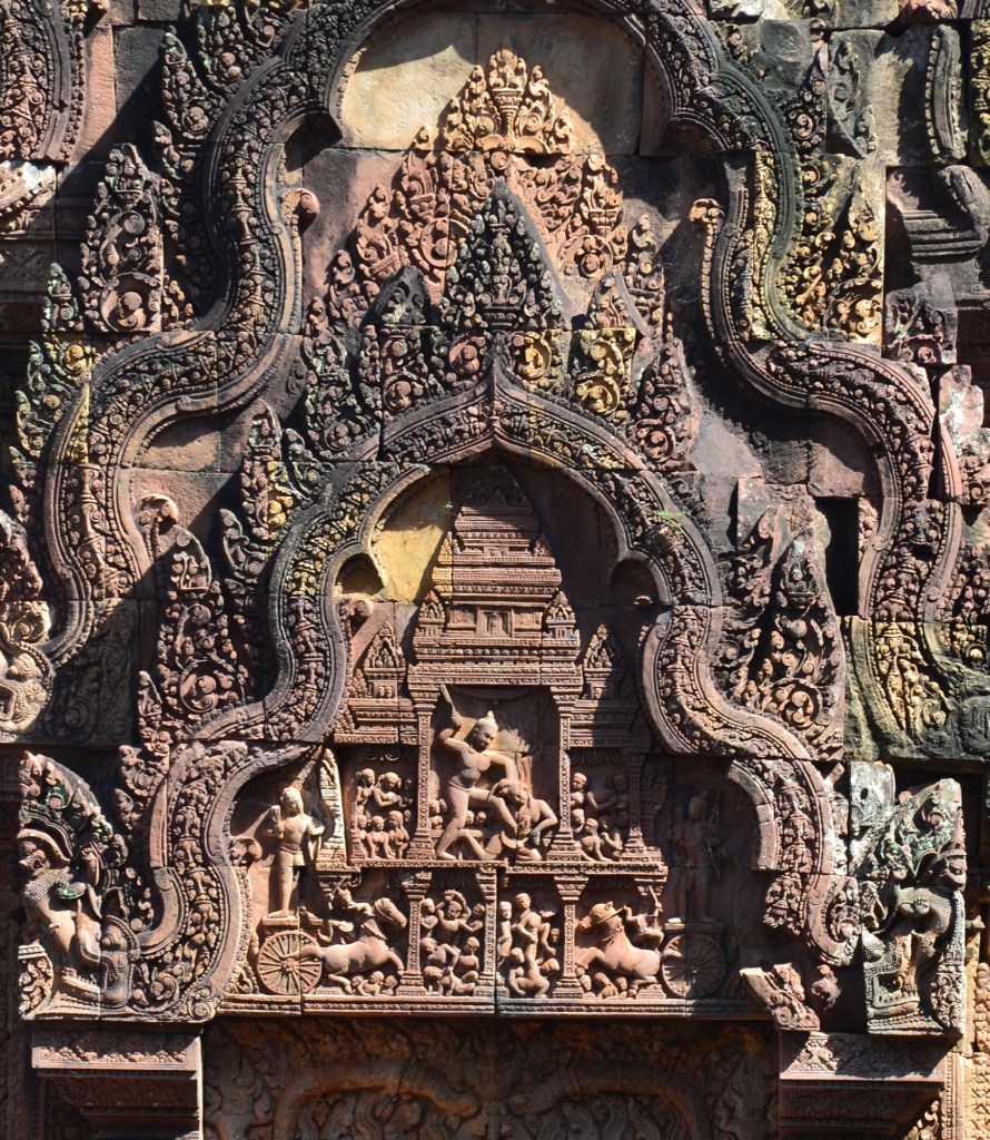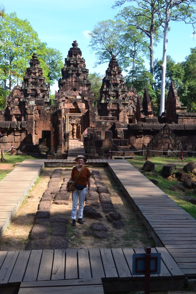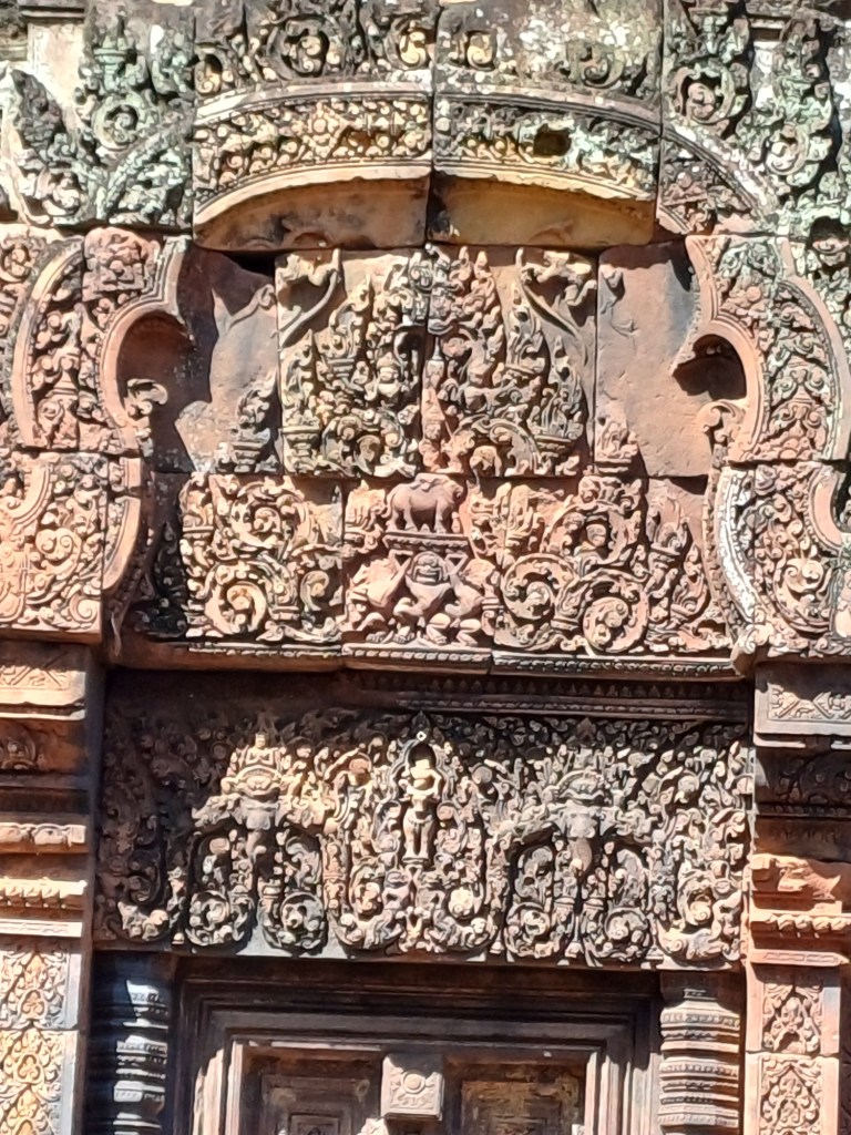 En tenslotte deze dag alweer en ook als besluit een van de mooiste tempels: Banteay Srei. De naam betekent ‘vrouwen citadel’, of ‘citadel van schoonheid’. Hij was niet voor vrouwen bedoeld, mocht iemand dat denken. (Ik heb in de gidsen weinig over vrouwen in de Angkortijd gelezen, behalve natuurlijk het gebruikelijke huishoudelijk werk).