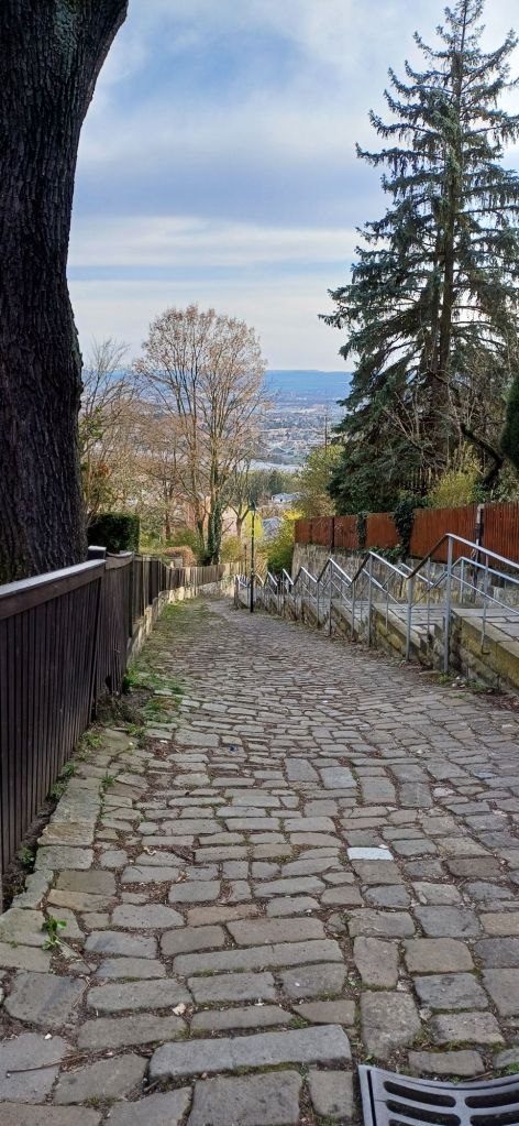 Ik heb thuis al jarenlang een beschrijving van een wandeling door deze wijk liggen, maar vergeten mee te nemen. In het toeristenbureau had de jonge medewerker nog nooit van Uwe Telkamp gehoord….. maar gelukkig hoorde een oudere vrouw van ons gesprek en gaf me de tip naar een boekwinkel onderaan de kabelbaan te gaan.