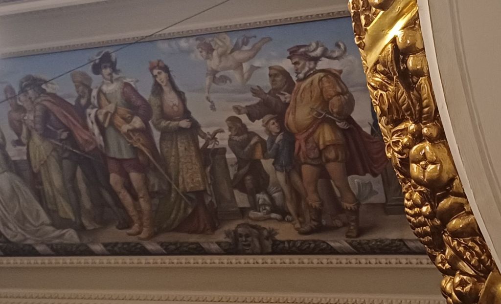 Het plafond in de koepel is helemaal beschilderd. Hoofdzakelijk met romantische taferelen. Ik denk scènes uit opera’s. ( lijkt me logisch).