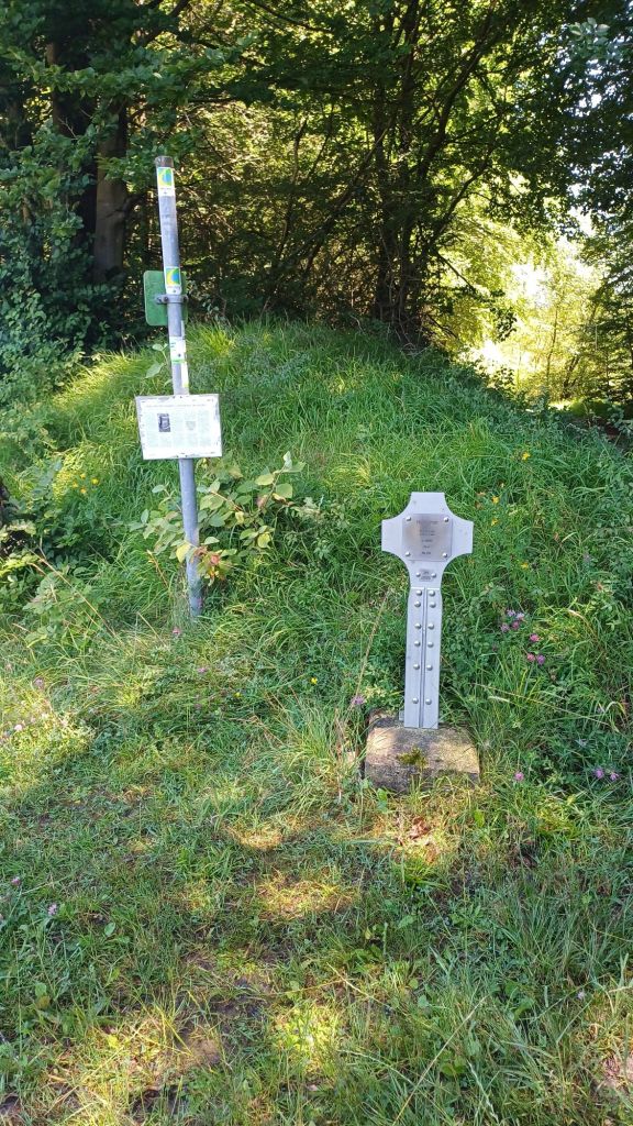 Dit kruis wordt herhaaldelijk beklad met nazi tekens en -kreten. En dan ook telkens weer schoongemaakt. Op het bordje erachter staat een krantenartikel hierover. En daarboven op de paal het teken van de Eifelsteig. Ganz praktisch!