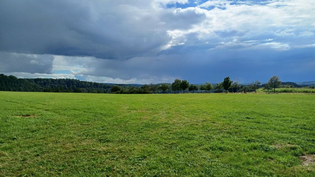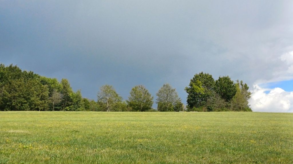 Deze wolk barstte uiteindelijk los. Er zat zelfs hagel tussen. Gelukkig allemaal niet op een moeilijk paadje maar jammer genoeg ook niet in een dicht bos.