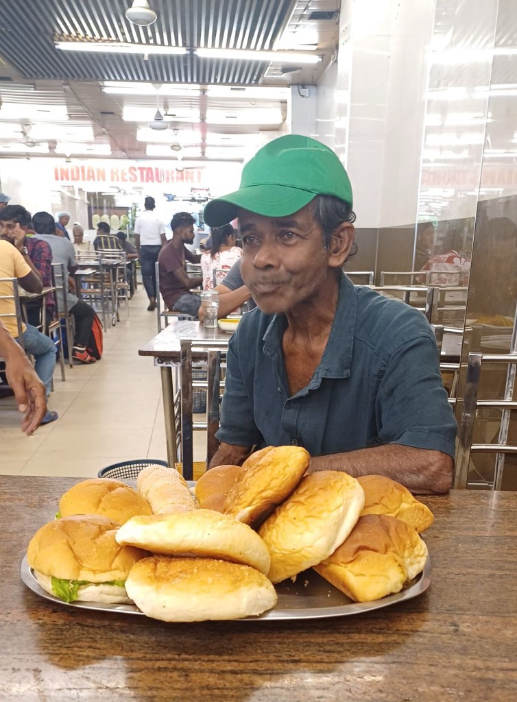 In dit restaurant wilde ik (eindelijk) iets drinken en wat eten, een samoza bv. Er waren geen ‘vegetable’ samoza’s, dus heb ik iets gelijksoortigs, maar toch onduidelijks gegeten. Vlak daarna schoof deze aardige man aan. Hij kreeg een enorme schaal met kadetten voor zich. Kadetten belegd met alweer wat onduidelijks. Kortom een vreemd Indiaas restaurant!