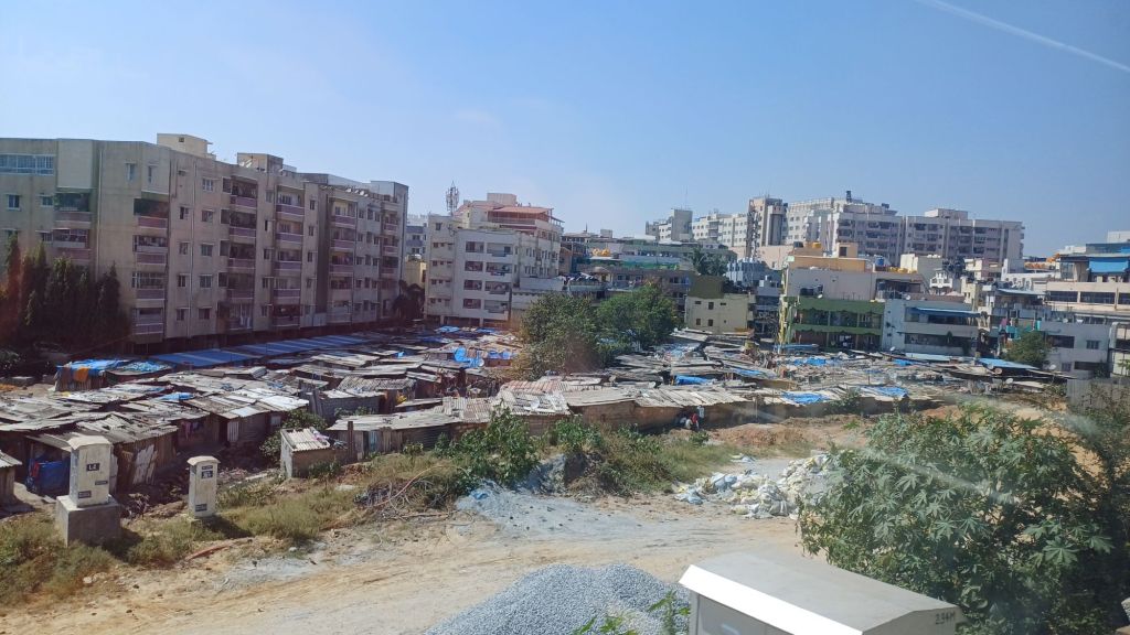Zo reed de trein Bengalure binnen; en dat is wat je bij het binnen rijden bij elke grote stad in India ziet: dicht opeen gepakte krottenwijken.