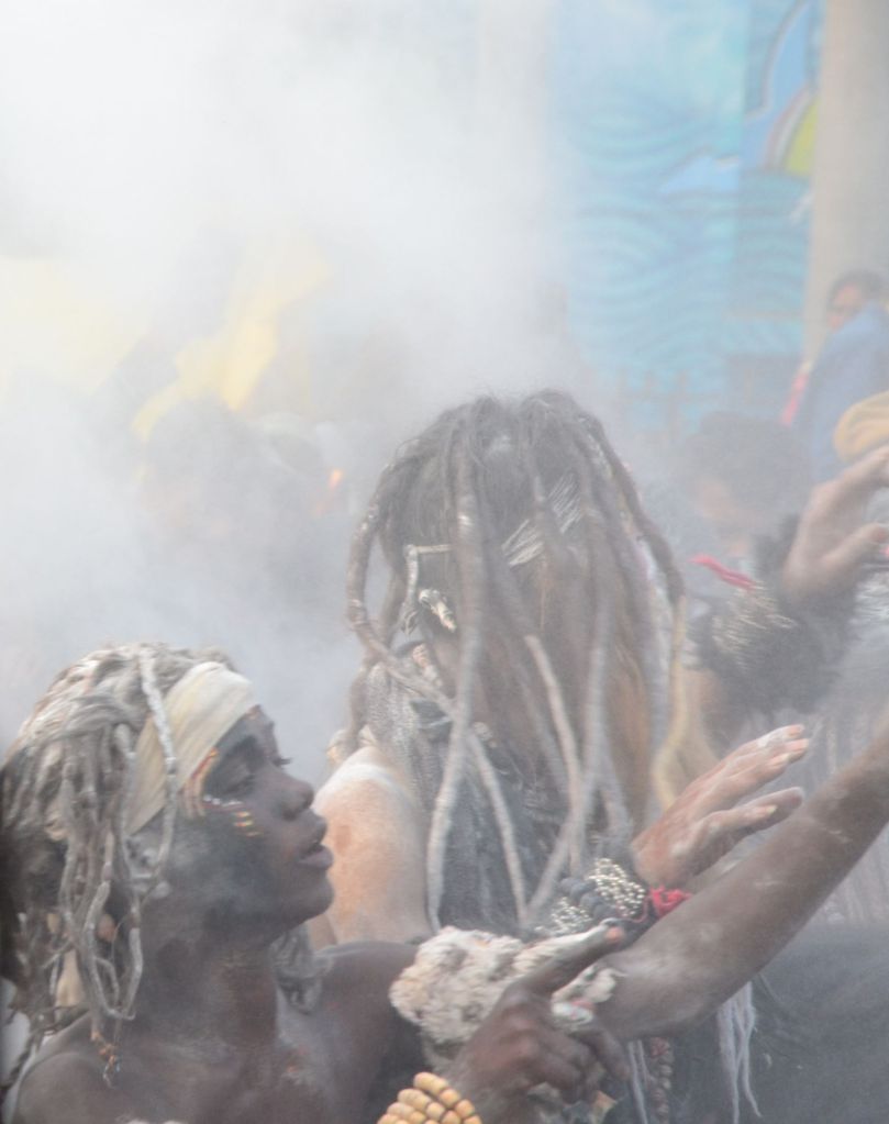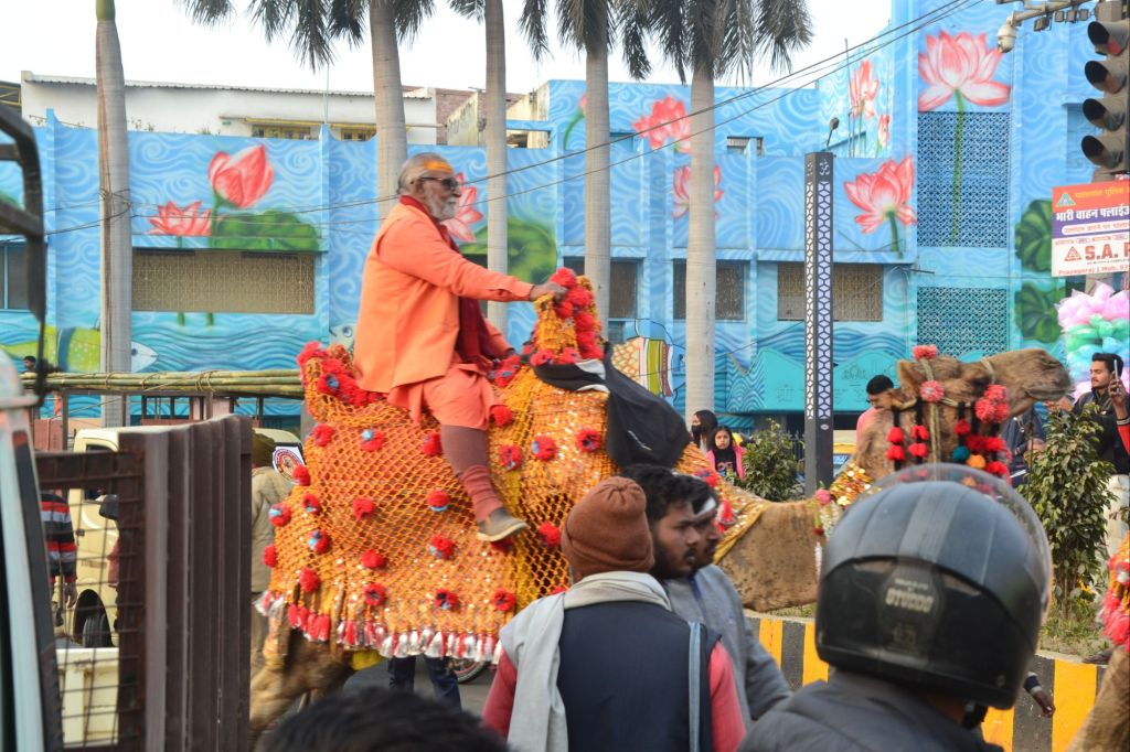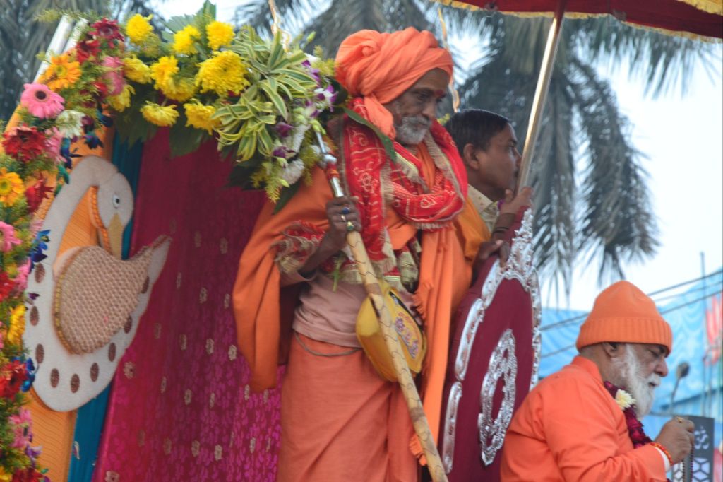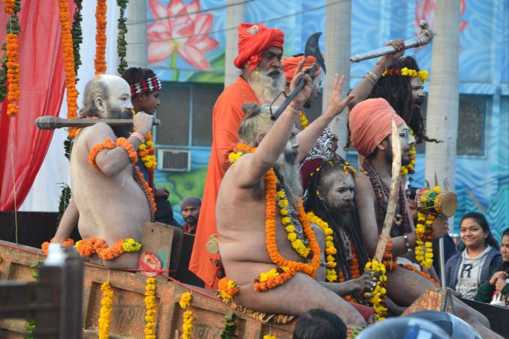 Bij de opening van het festival rijden de leiders van de verschillende saddhu en yogi sekten op praalwagens door de stad naar de Sangam, de heilige plaats waar de rivieren samen stromen.