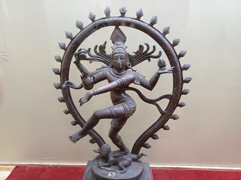 ‘U kent natuurlijk de voorstelling van de dansende Shiva? Hij, met twee benen en de vier armen, dansend, springend binnen een cirkel van kosmisch vuur, met 1 voet opgeheven en de andere geplant op het lichaam van onwetendheid en kwaad, om die op hun plaats te houden. De dansende Shiva, de dans van schepping, behoud en vernietiging. Een complete kringloop. Een volkomenheid. Het is een moeilijk begrip, men moet er met het hart op reageren, niet met het hoofd.’