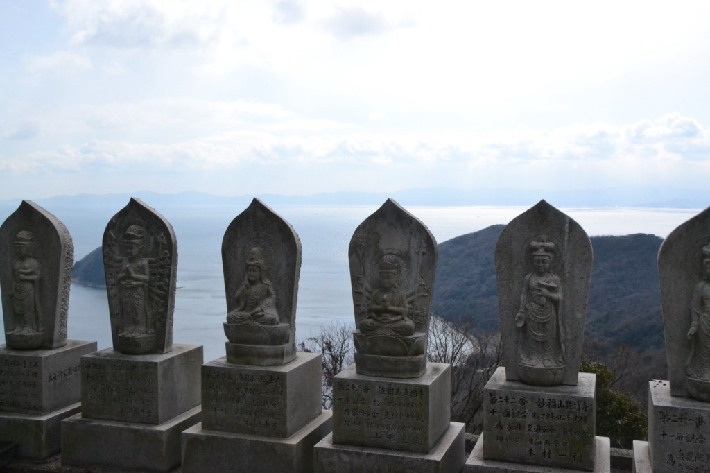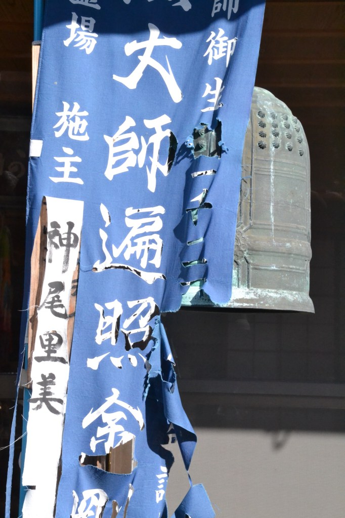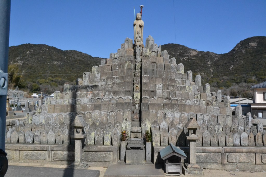 Sommige tempels die op ‘onze lijst’ staan, staan bij kerkhoven. Een veelzijdig gebruik dus van de tempel. Rouwenden, pelgrims en wie weet wat nog meer. Op de kerkhoven staat soms een groot piramide-achtig bouwsel. Een familiegraf? Bovenaan de top staat een beeld van Kobo Daishi. En deze heeft niet alleen een staf in de hand, maar aan hem is ook een lampje bevestigd.