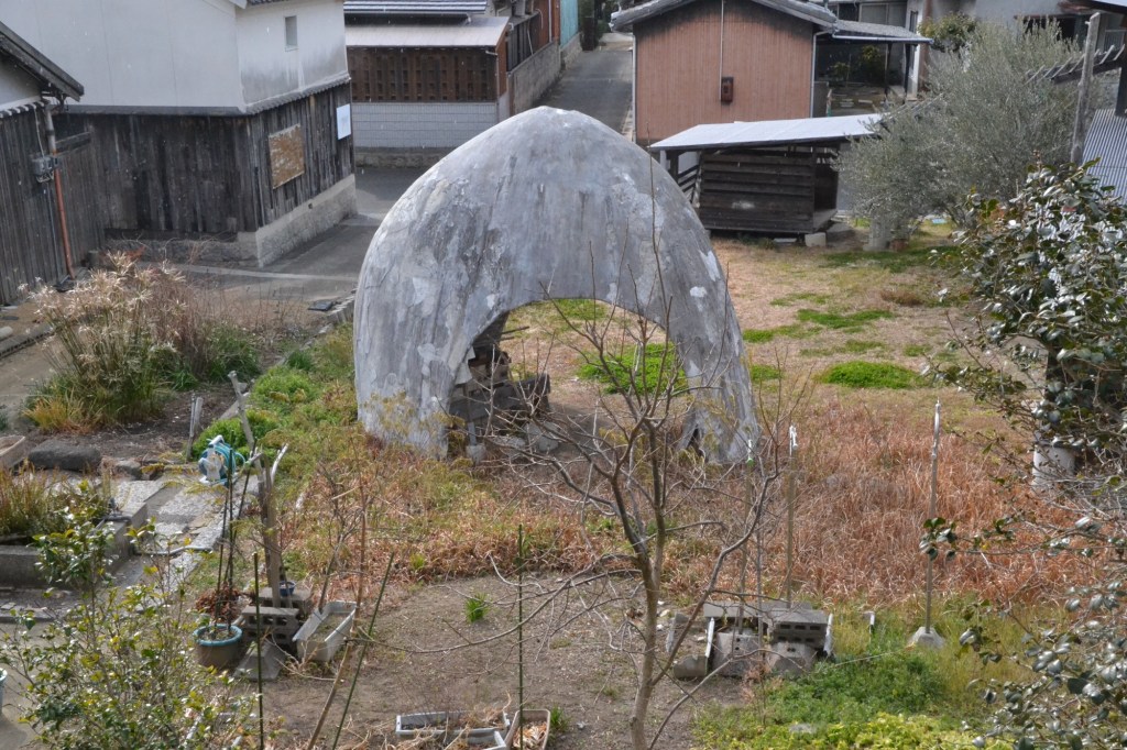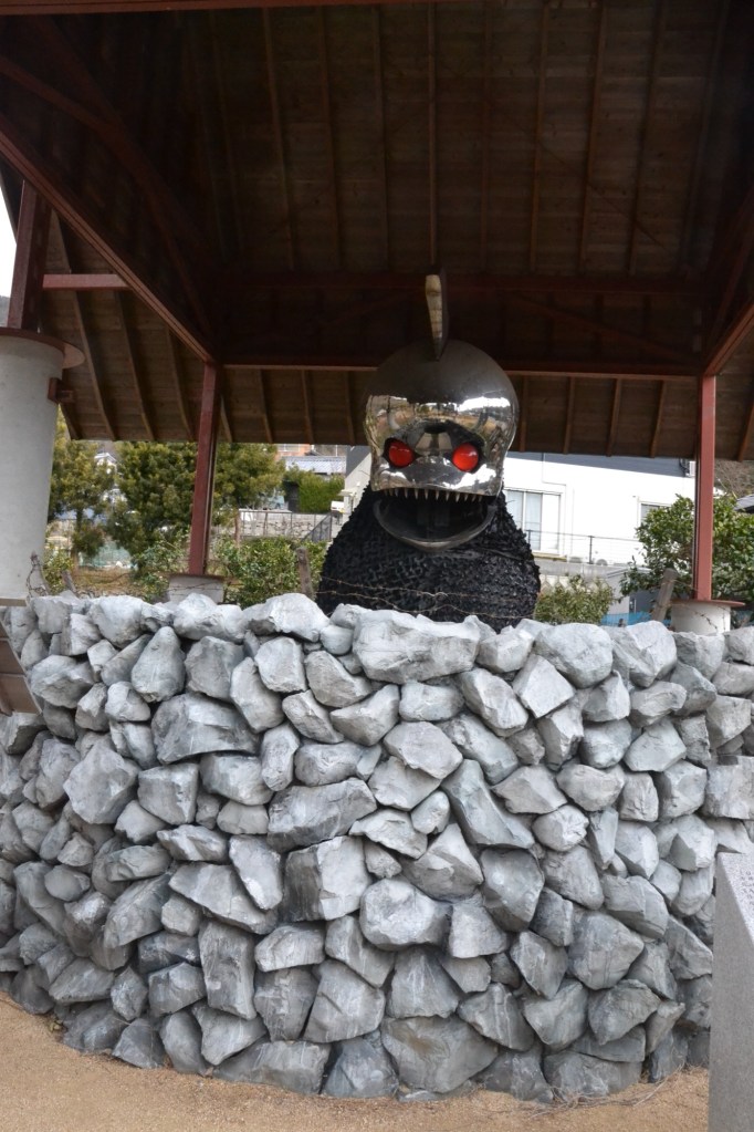 Op de eilanden van de binnenzee wordt eens in de drie jaar de Setouchi Triënnale georganiseerd. Men is begonnen de aanstaande in te richten. Zo liepen we langs dit werk. We dachten eerst dat het iets voor kinderen was, maar daar is het veel te boosaardig voor. Het is een echt kunstwerk van de Triënnale. (Ik heb het even opgezocht).
