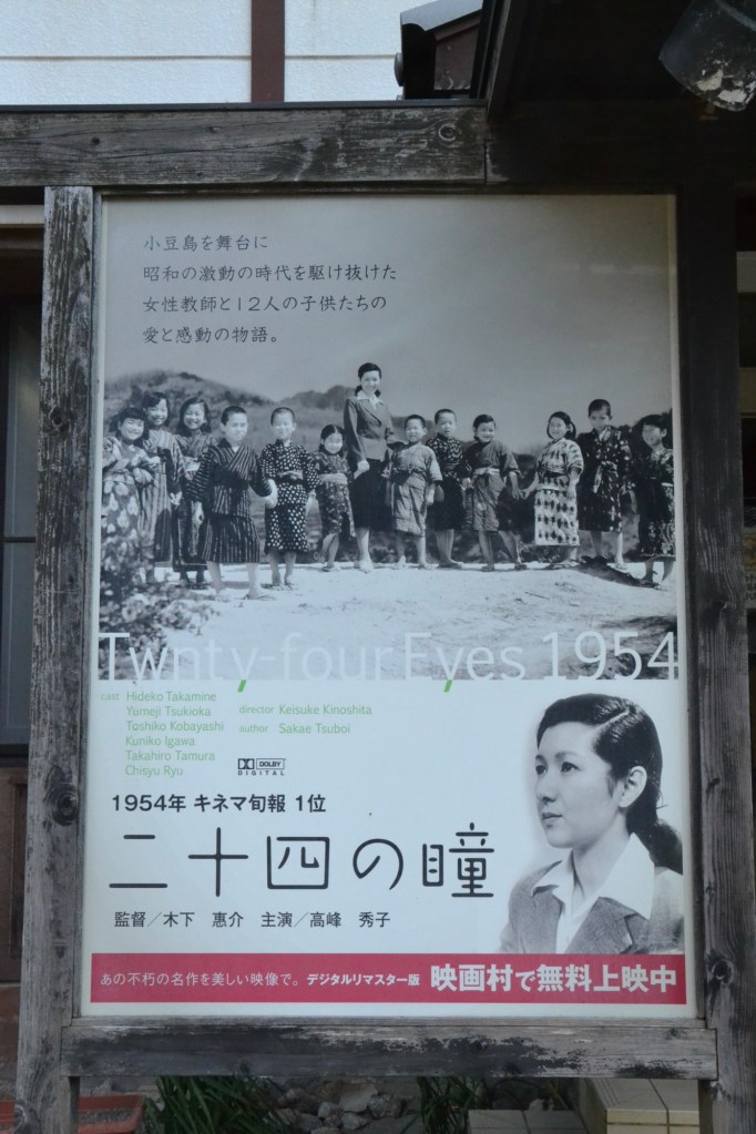 En nog een foutje dat hersteld moet worden, het beeld dat aan de haven in Tonosho staat, waarvan ik een detail liet zien, is een afbeelding uit de film Twenty Four Eyes, uit 1954. Het is een beeld van een onderwijzeres (de hoofdrol) met kinderen. De film handelt over 3 periodes uit de geschiedenis van Japan: voor de Tweede Wereldoorlog, tijdens en na. En de film speelt op Shodoshima en is daar ook opgenomen. Het oude schoolgebouw staat er nog steeds en is te bezichtigen.