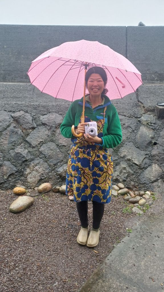 Als afscheid neemt Miroo twee polaroid foto’s, één voor zichzelf (de foto’s van alle henro gasten hangen aan een waslijntje aan de muur) en één voor mij. Miroo heeft een tijd in Kameroen gewoond, vandaar haar schort met een Afrikaanse print. Gehuld in plastic ging ik op weg. Ik twijfelde of ik de trein zou nemen, maar toen ik eenmaal liep, was dat eigenlijk heel fijn, zo in de regen te lopen. Ik moest naar Shimanto, het was maar 21 km, zonder glibberige paadjes.