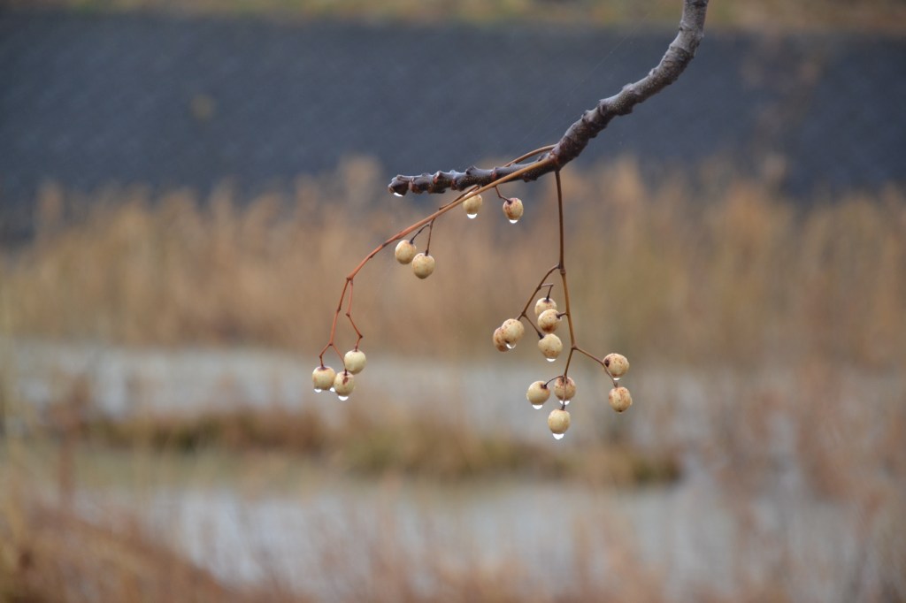 Elke keer als ik deze boom zag, wilde ik een foto maken van die balletjes tegen die strak blauwe lucht. Maar het kwam er niet van. Maar de balletjes met regendruppels zijn ook mooi.