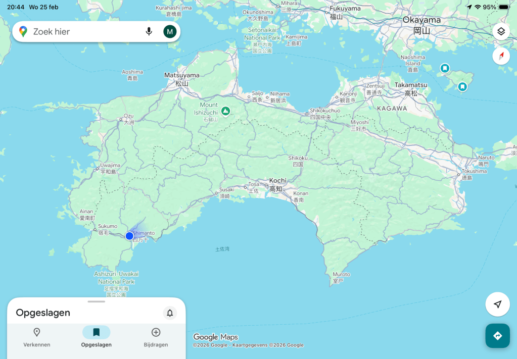 Rechts ligt Tokushima, met daarboven Naruto, waar de Henro begint. Via Kōchi ben ik nu in Shimanto.