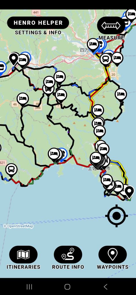 Vanaf Shimanto, daar ben ik nu (bij ‘measure’) ga ik in 2 dagen (39 km) naar tempel 38, Kongofuku-ji, helemaal rechts onder in. Vandaar loop ik om de kaap heen, sla rechts af en ga dan weer langs de kust terug tot ongeveer halverwege (20 km). Daar sla ik ‘linksaf’ naar ongeveer het midden van het kaartje (24 km) en tenslotte loop ik naar de zwarte stip links boven, daar ligt tempel 39 Enko-ji in het plaatsje Sukumo. Tempel 39 is de ‘grenstempel’ naar een nieuwe provincie en een nieuwe ‘dodo’. Hierover later meer. En daar stop ik wat betreft de henro.