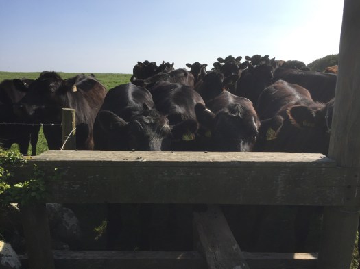 Halverwege de dag kwam ik in Port Isaac aan, en heb hier heerlijk met vissoep gelunched. Daarna weer op weg. De lucht betrok en trok dicht. Het boekje gaf een kortere route aan, door een weiland. Met het oog op het weer besloot ik deze route te nemen. In het weiland aangekomen stortregende het en was er nauwelijks een hand voor ogen te zien. En er stonden weer koeien, die ook nu weer enthousiast naar me toe kwamen. En ze volgden me, weliswaar op gepaste afstand, maar toch. Een 'uitgang' van dit pad kon ik niet vinden, dus ik ben terug gegaan en besloot over de weg naar Polzeath te gaan. Het was een stukje om, maar er waren geen glibberige weilanden, koeien of gladde paadjes op het klif.